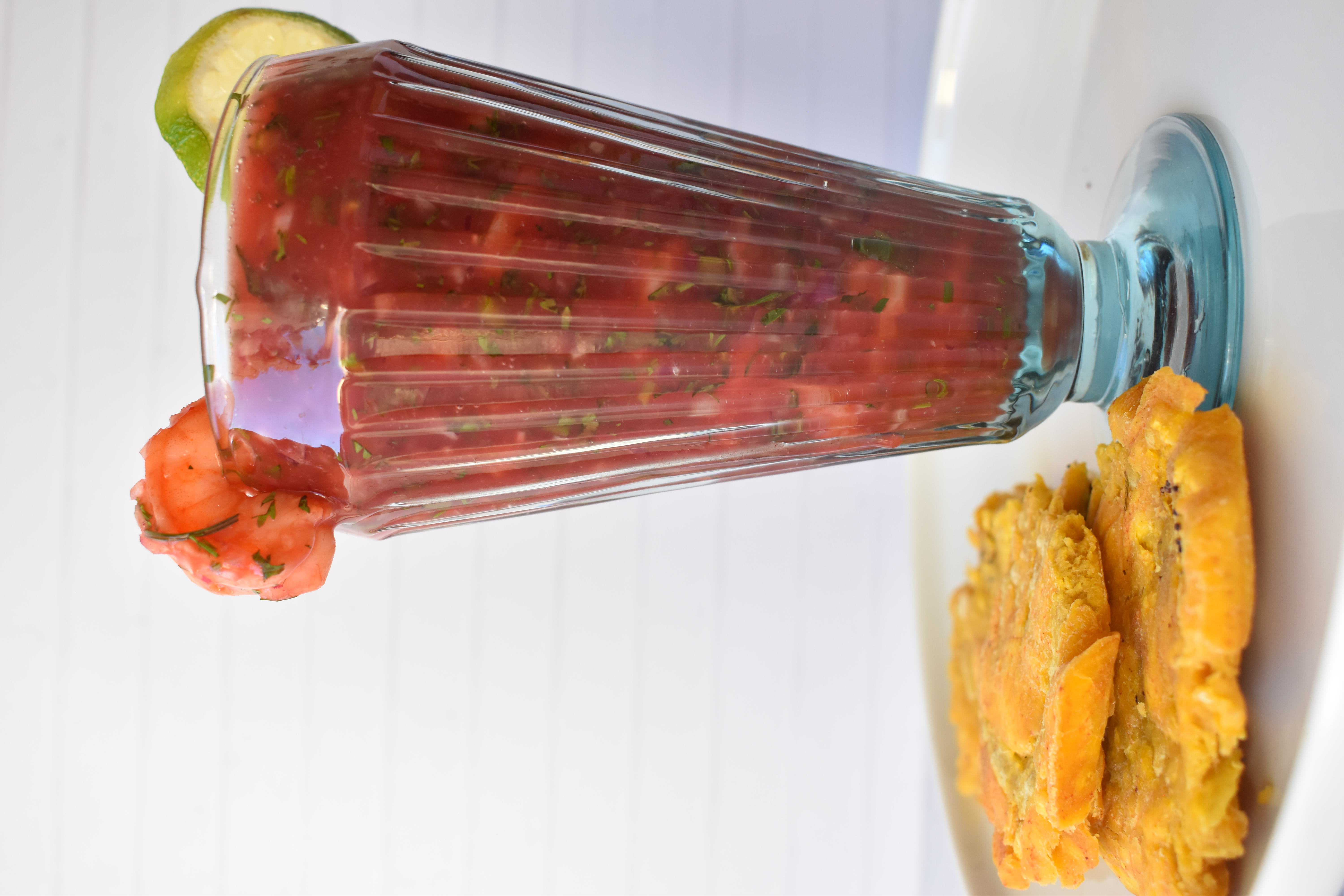 Copa de camarones en salsa de tomate, mayonesa, cilantro, cebolla, limón y ají. Acompañado de patacón o galletas.