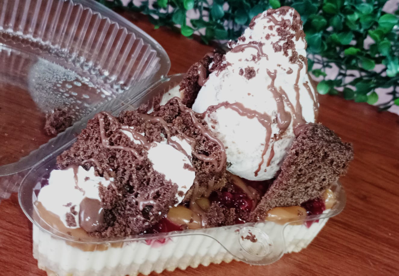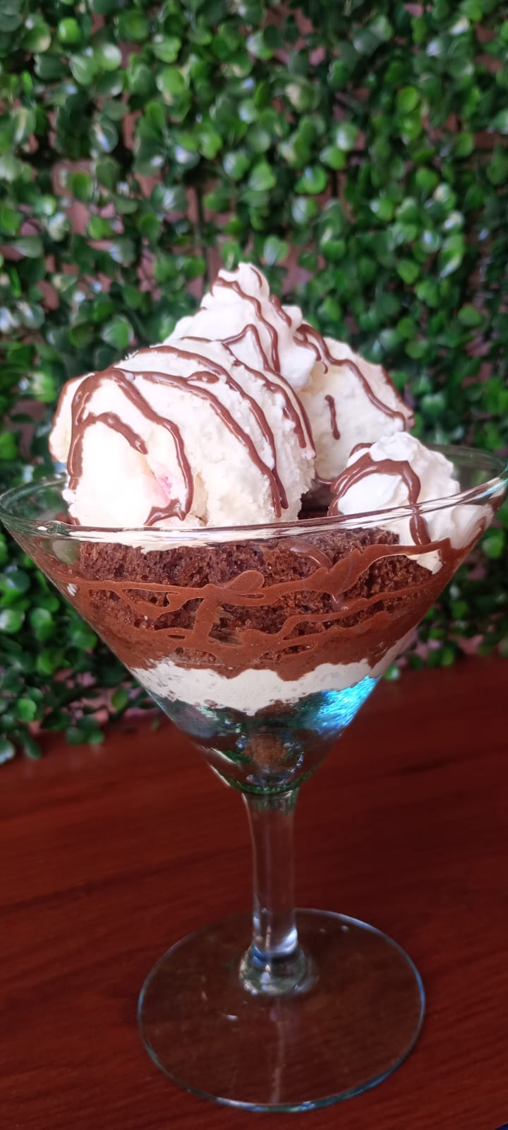 Miga de brownie, crema chantilly, doble helado, porción de brownie, salsa de chocolate y chocolate triturado.