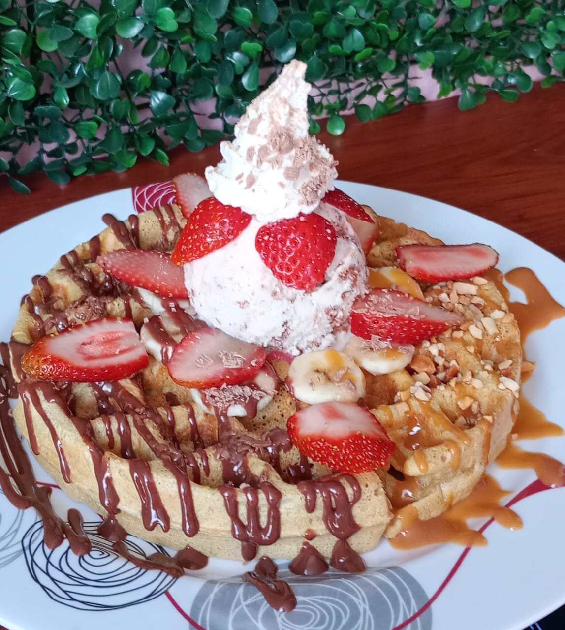 Waffle con banano, fresa, salsa de chocolate, salsa de arequipe, maní, trozos de chocolate, crema chantilly y una bola de helado.