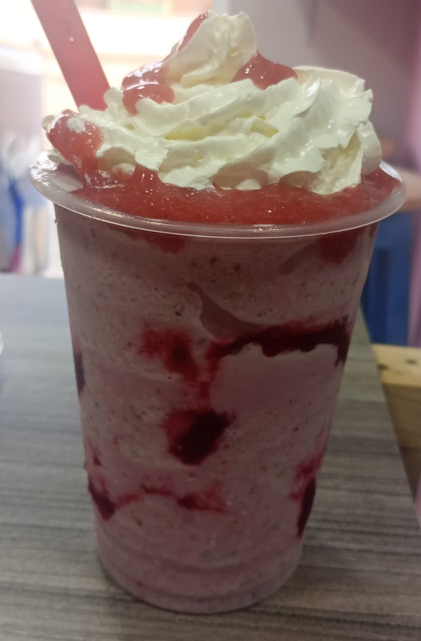 Malteada de 16 oz con crema chantilly, salsa de fresa y mora artesanal.
