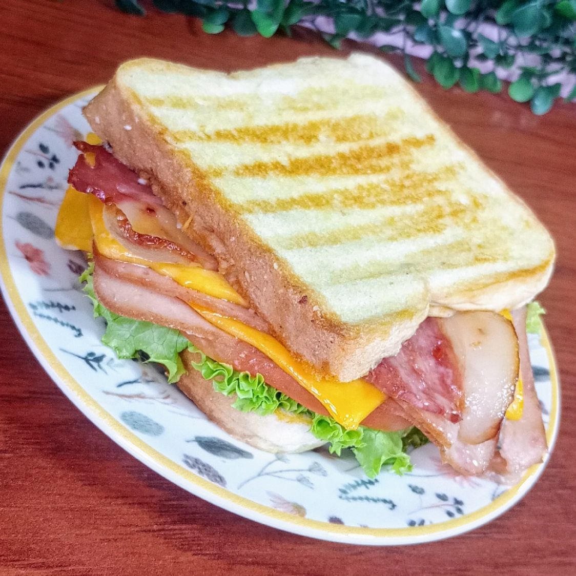 Pan dorado en mantequilla, doble jamón, doble queso, tocineta, lechuga, tomate y salsa de la casa