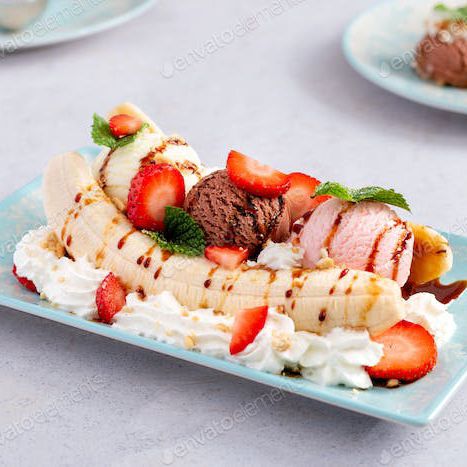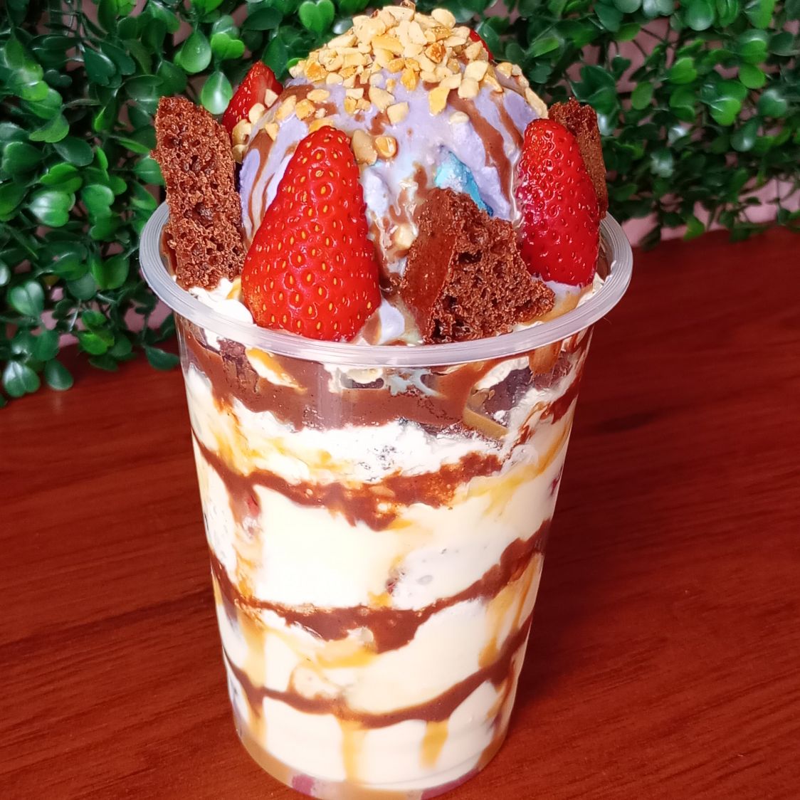 Base de fresas con crema,tres bolas de helado,banano,salsa de chocolate,crema Chantilly y mani