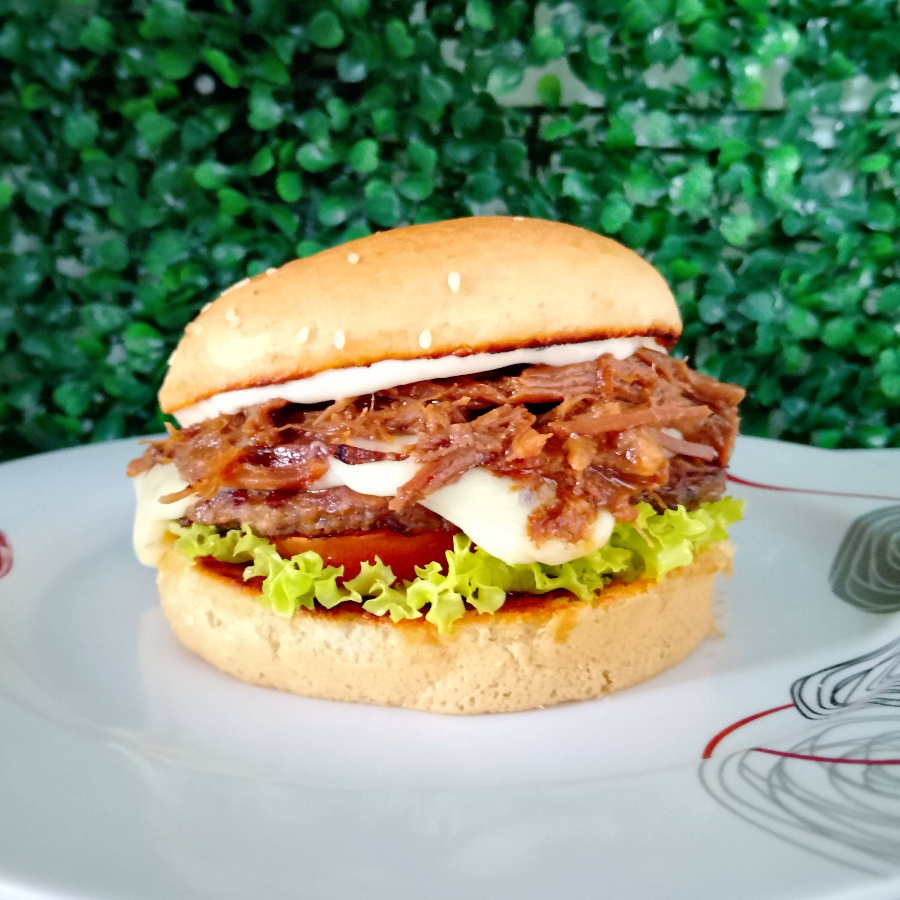 Hamburguesa con pan dorado en mantequilla, salsas tradionales, carné 100% de res, queso, cebolla grille, carne en bbq de cerveza y salsas de la casa