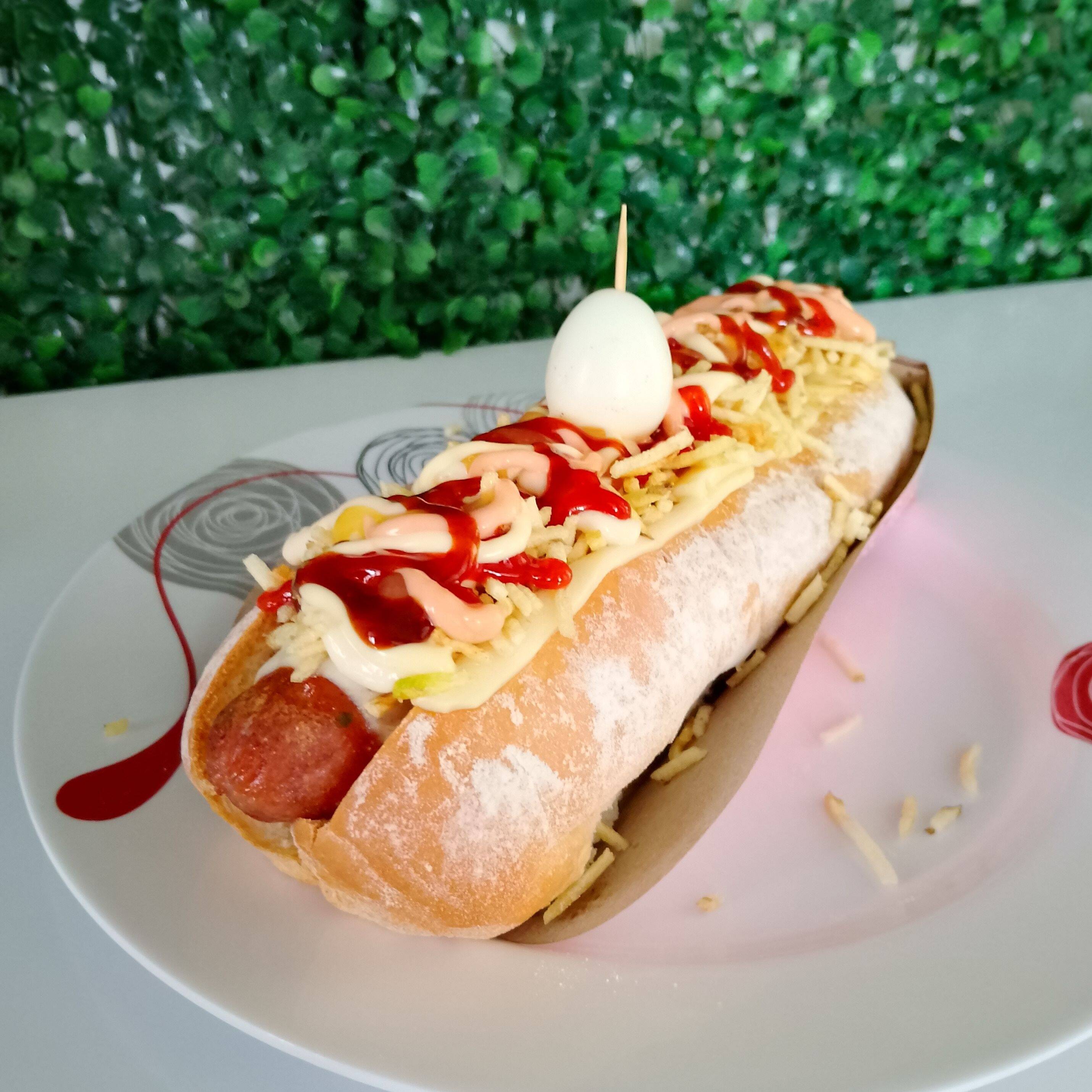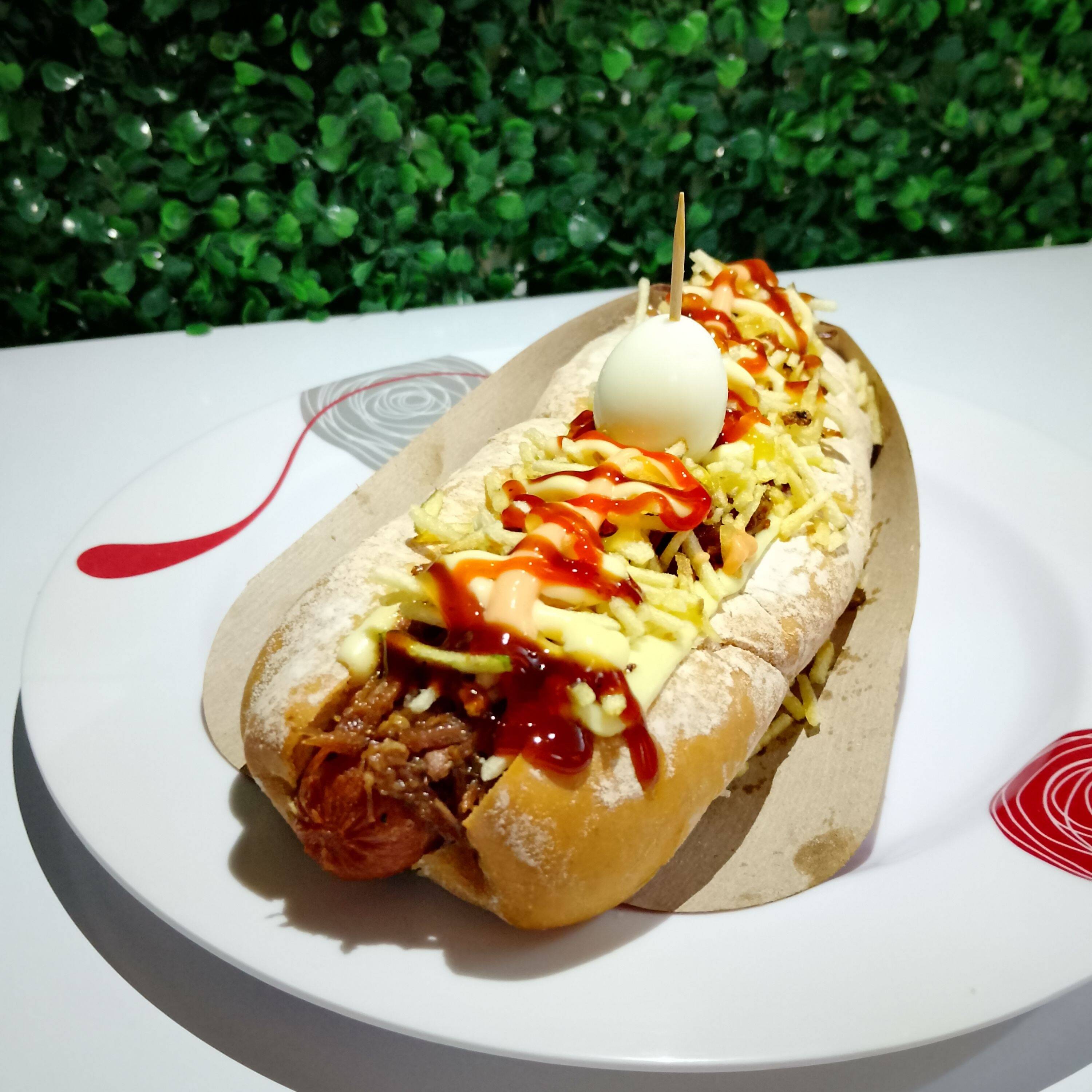 Perro caliente con pan artesanal, salchicha americana, cebolla grille, queso, salsas tradicionales y de la casa, papa fosforo y huevo de codorniz