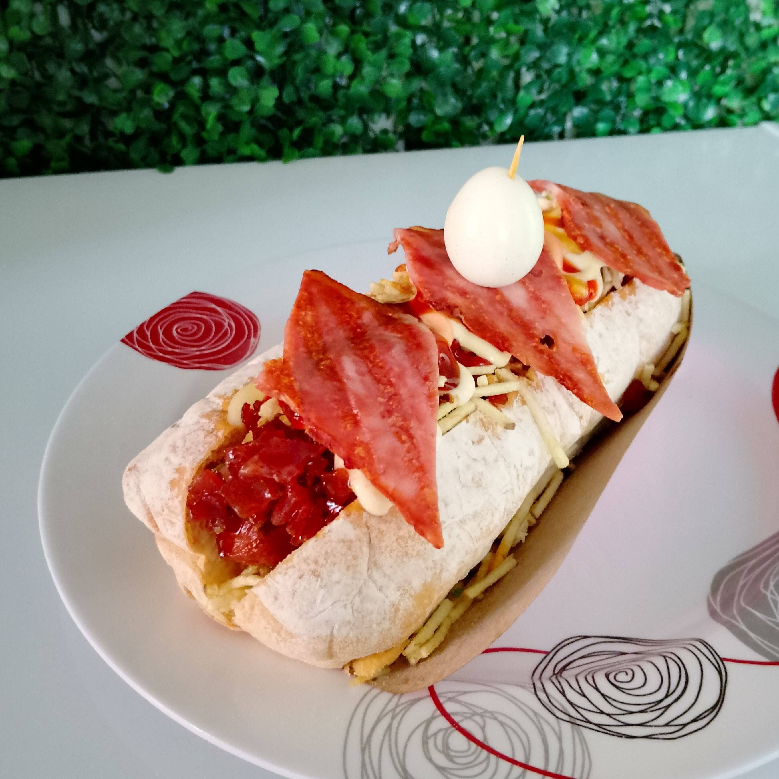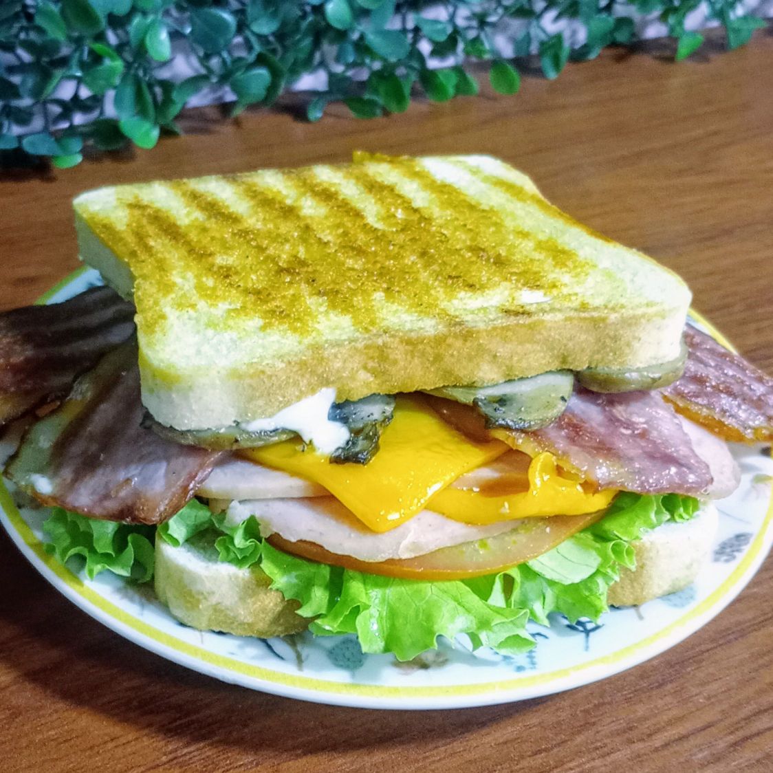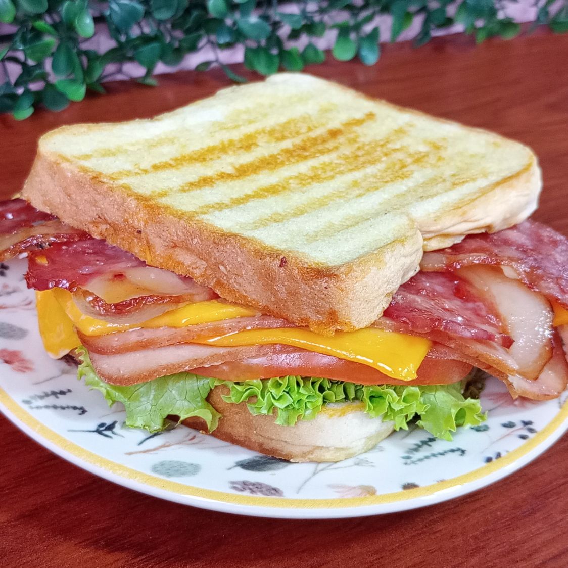 Pan dorado en mantequilla, doble jamón, doble queso, doble tocineta, lechuga, tomate y salsa de la casa