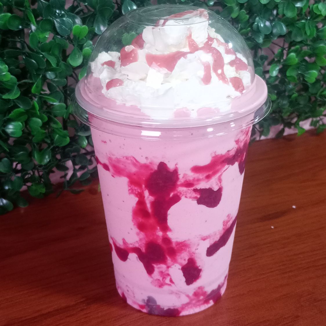 Frappé de 16 oz con crema chantilly y salsa de fresa y mora artesanal.