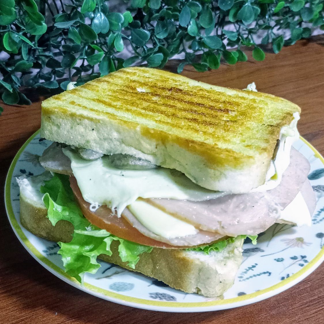 Pan dorado en mantequilla, jamón, queso, lechuga, tomate y salsa de la casa