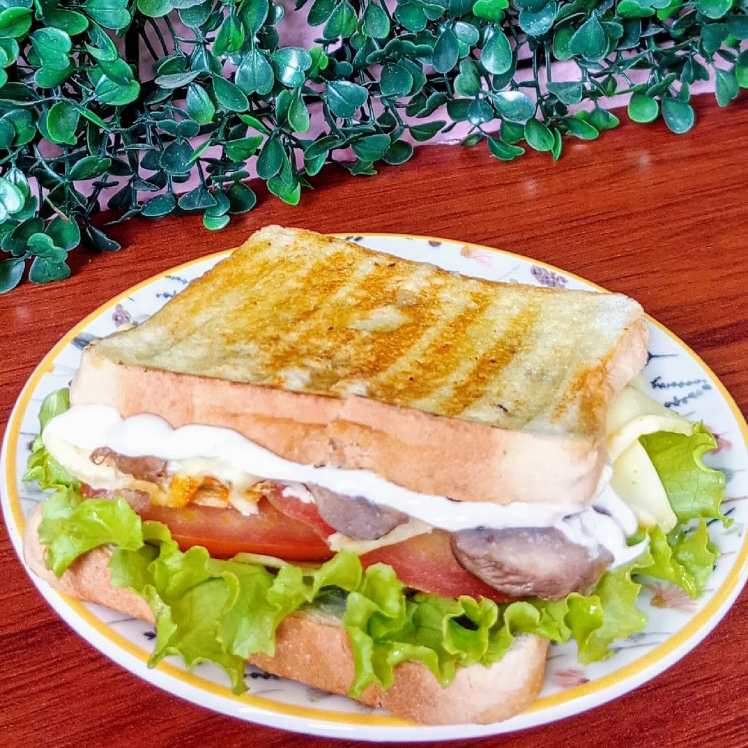 Pan dorado en mantequilla, doble jamón, doble queso, champiñones salteados en salsa portobello, lechuga, tomate y salsa de la casa