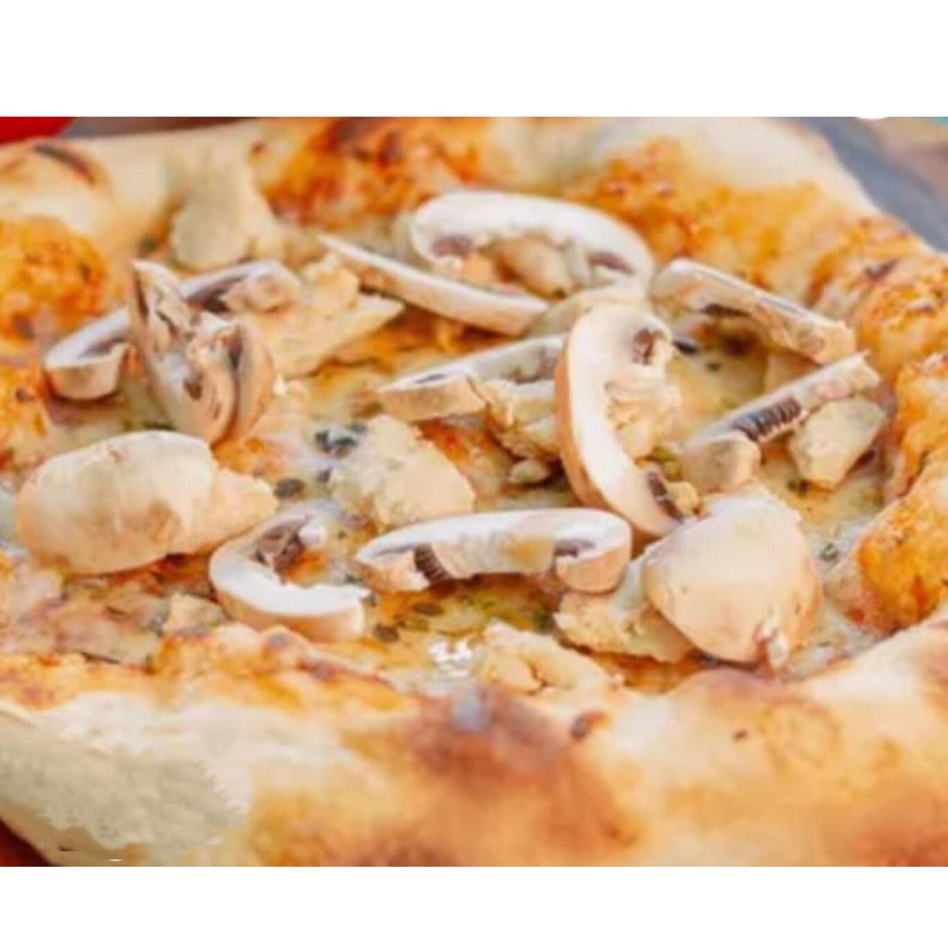 Pizza personal (20x20 cm) Salsa napolitana, queso mozzarella, pollo, champiñón.