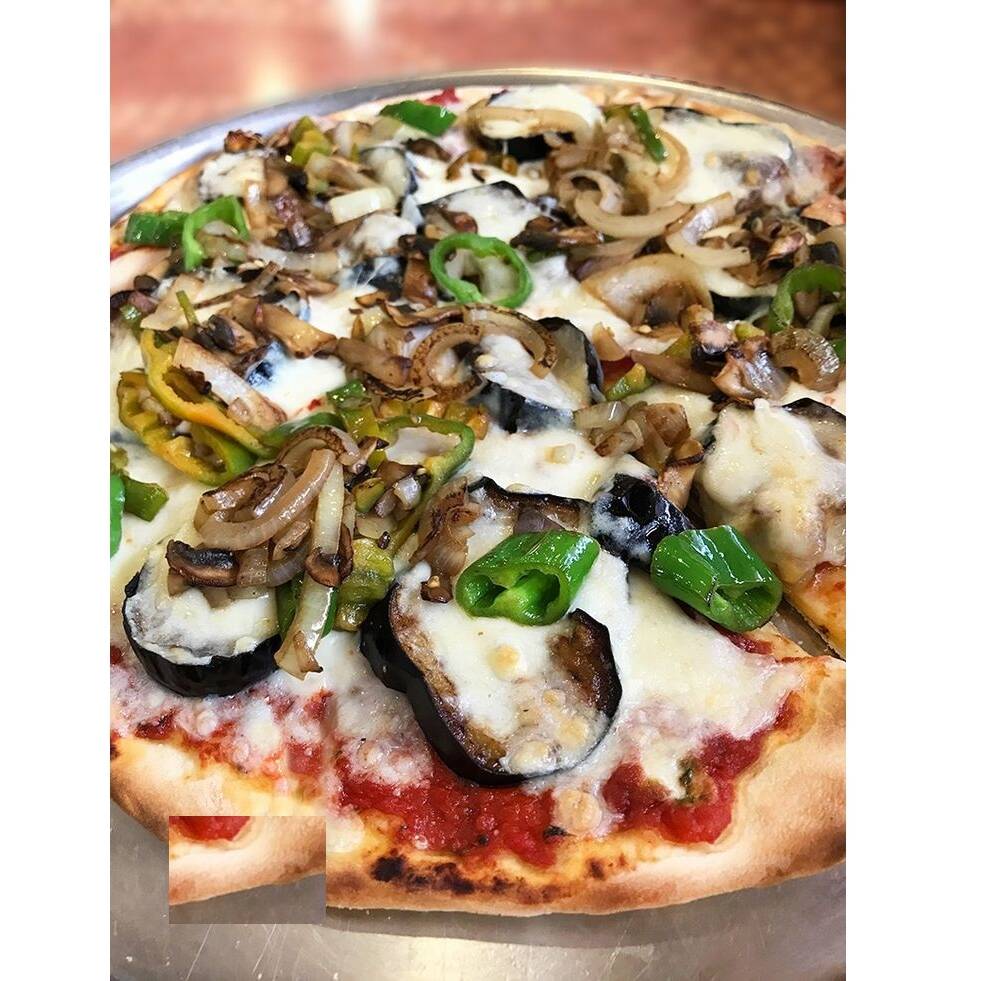 Pizza personal (20x20 cm) Salsa napolitana, queso de almendras, zukini, berenjena, champiñón, pimentón.