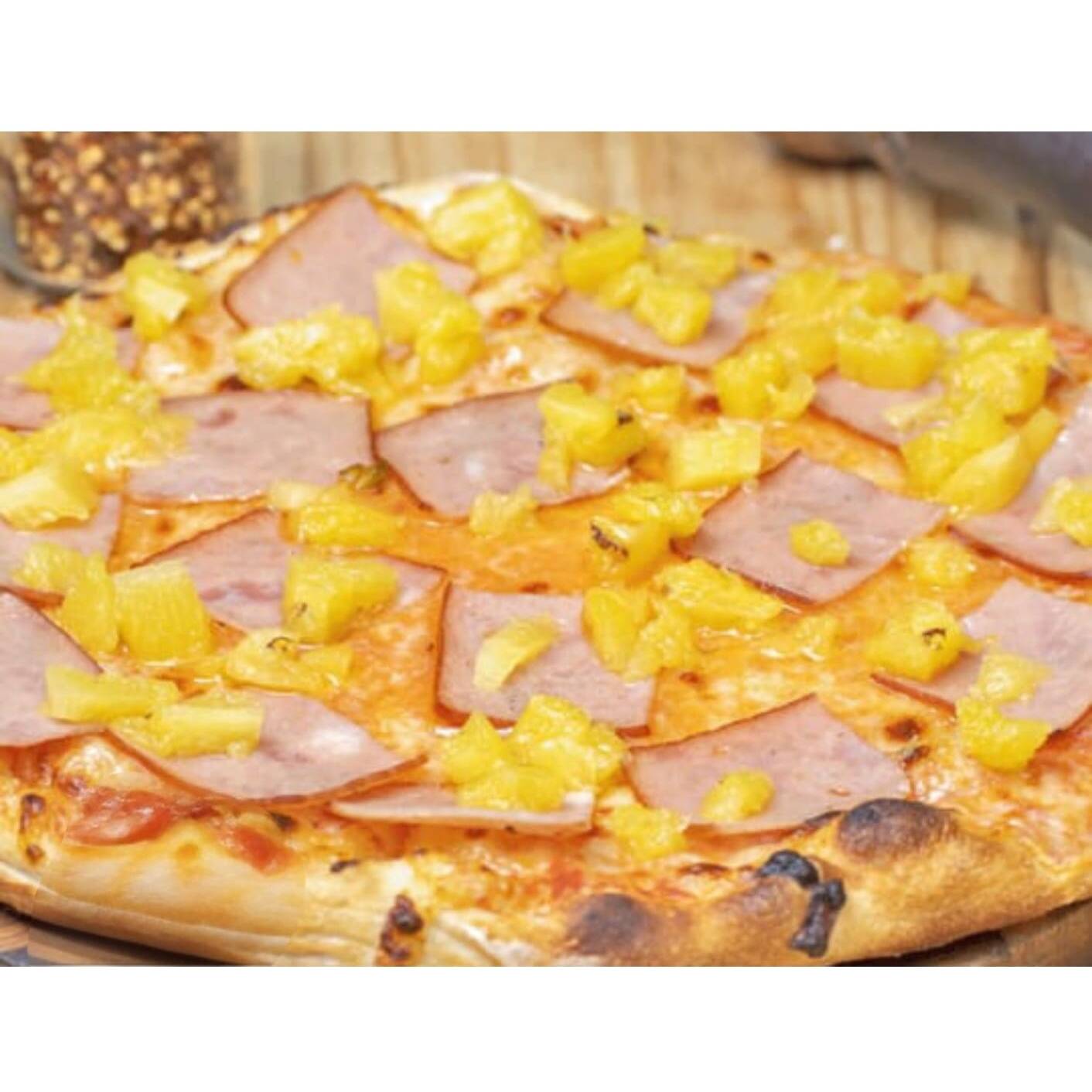 Pizza personal (20x20 cm) Salsa napolitana, queso mozzarella, tocineta, piña y salsa spicy.