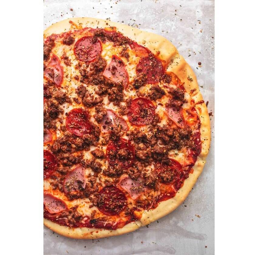 Pizza personal (20x20 cm) Salsa napolitana, queso mozzarella, jamón, pepperoni, carne.