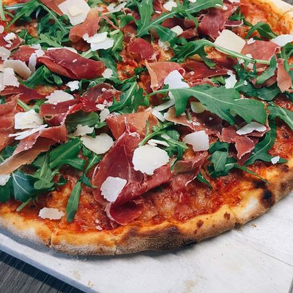 Pizza personal (2020 cm) Salsa napolitana, queso mozzarella, jamón serrano, rúgula, balsámico.