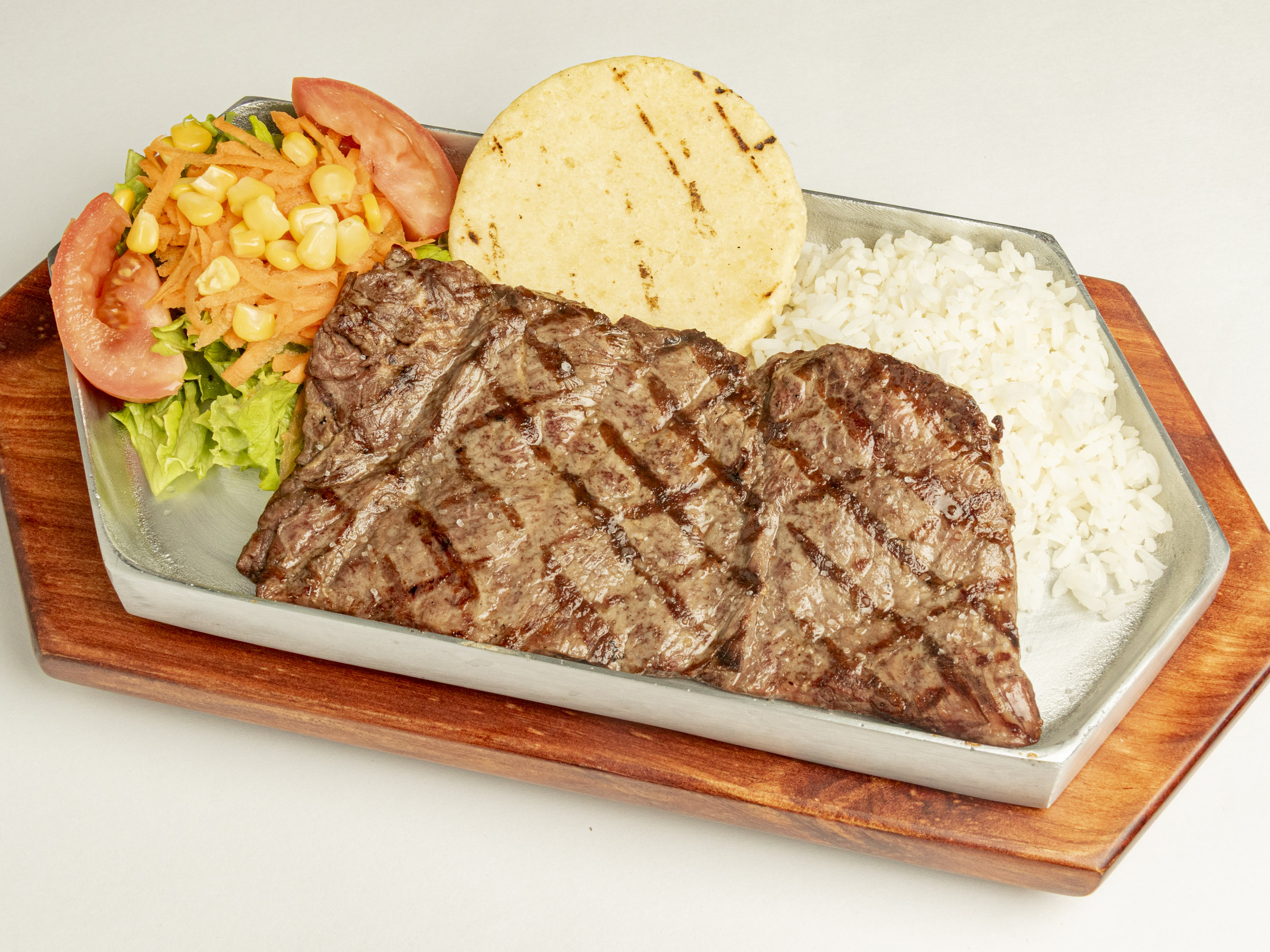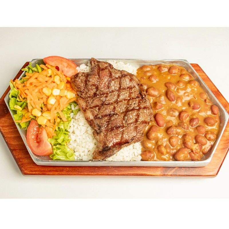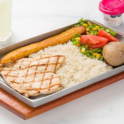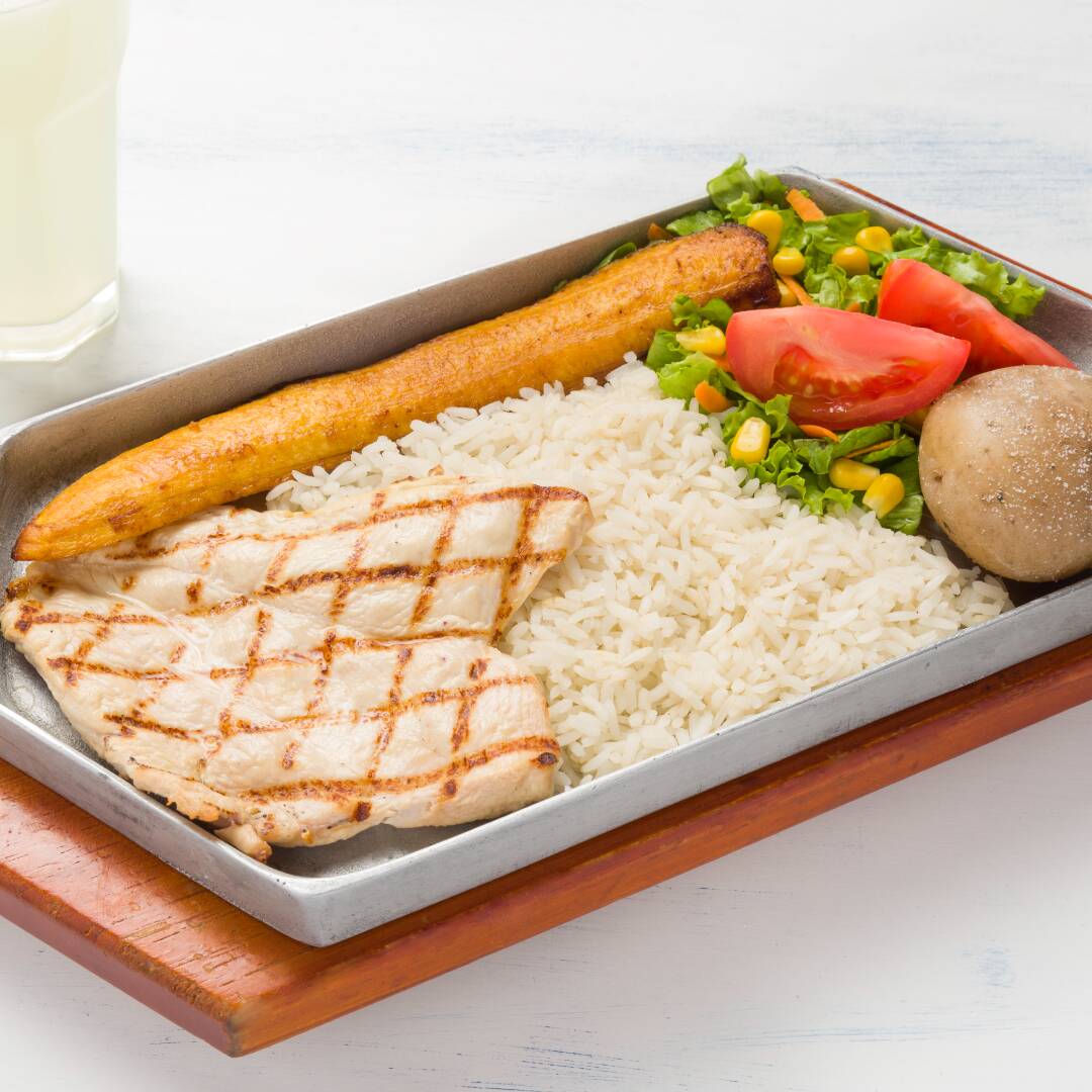 Media porción de carne de res, de pollo o de cerdo acompañado de arroz, plátano maduro, papa salada, ensalada de tomate, lechuga y cebolla más una bebida a elección.