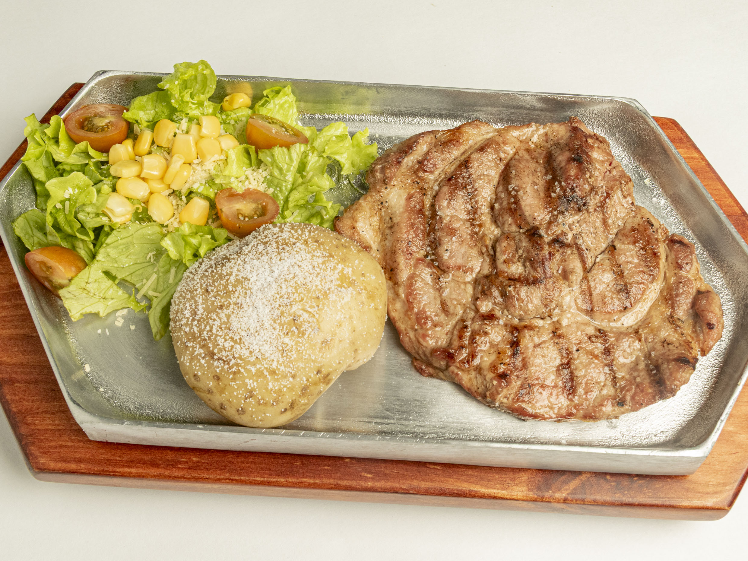 Lomo de cerdo a la parrilla, ensalada fresca y fríjol o lenteja. Completo y delicioso.