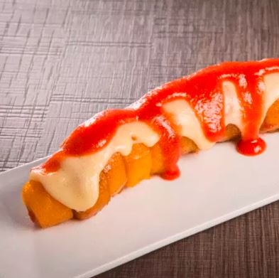 Plátano maduro con queso derretido y jalea de guayaba.