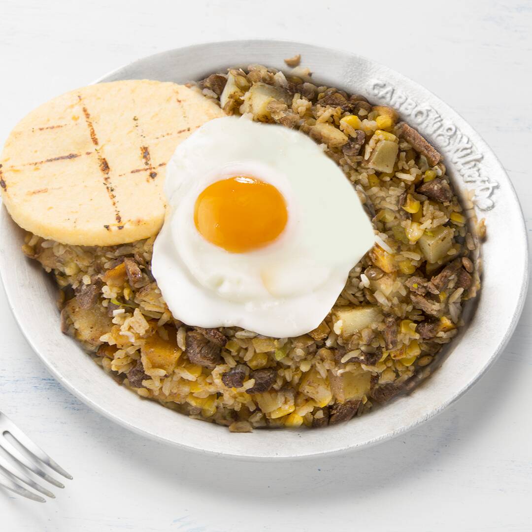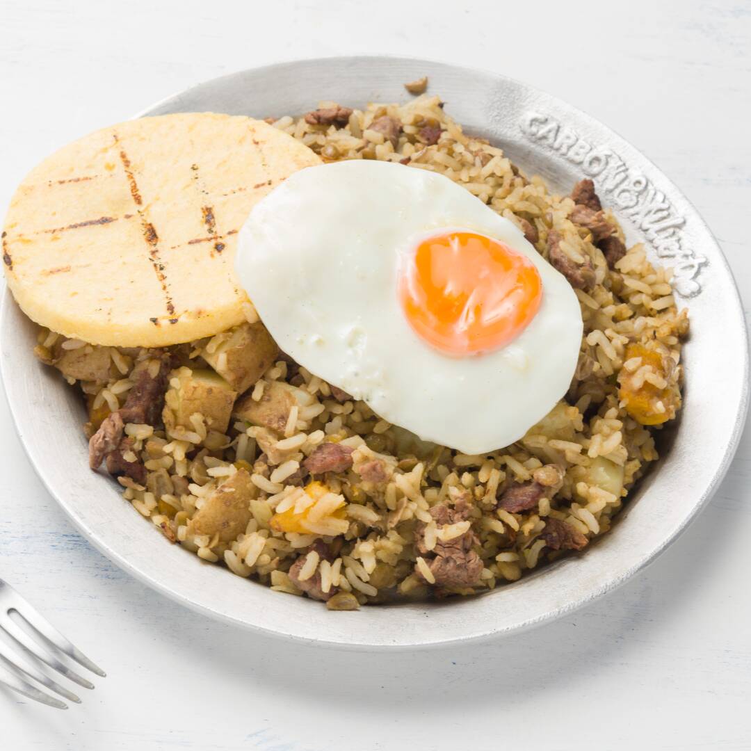 Tradicional arroz con frijoles, acompañado de trozos de carne de res, plátano maduro picado, huevo frito y arepa.