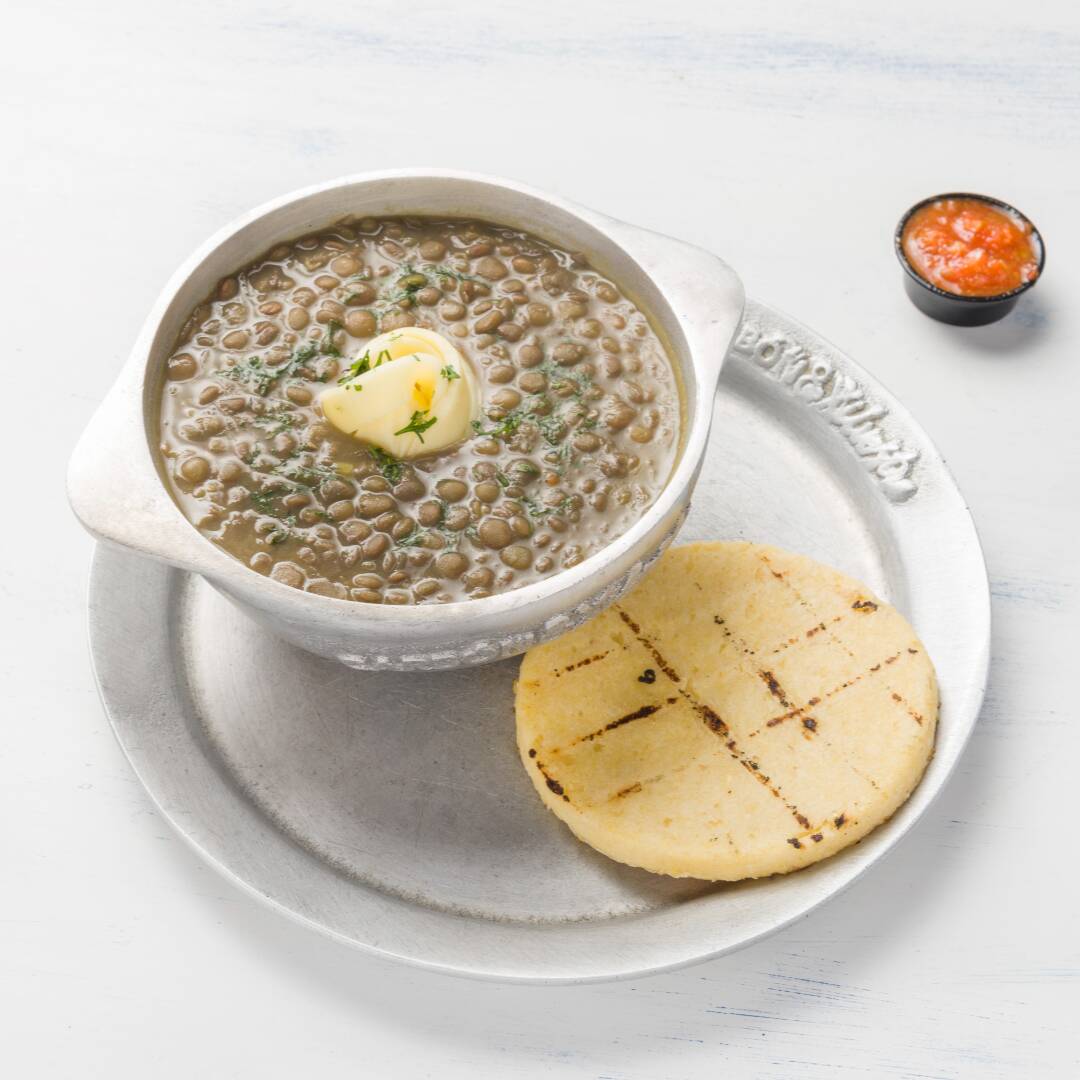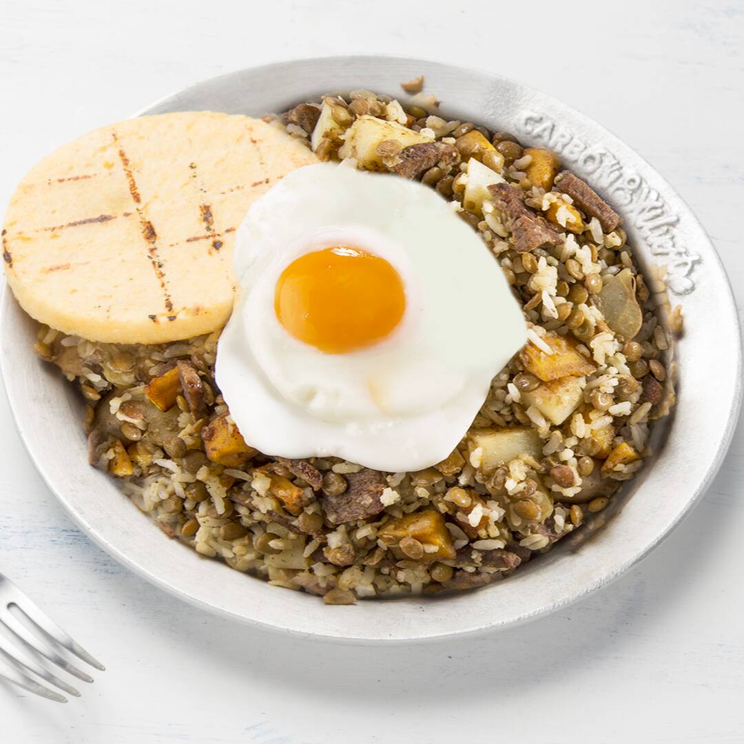 Espectacular calentado con lentejas, acompañado de trozos de carne de res, plátano maduro picado, huevo frito y arepa.
