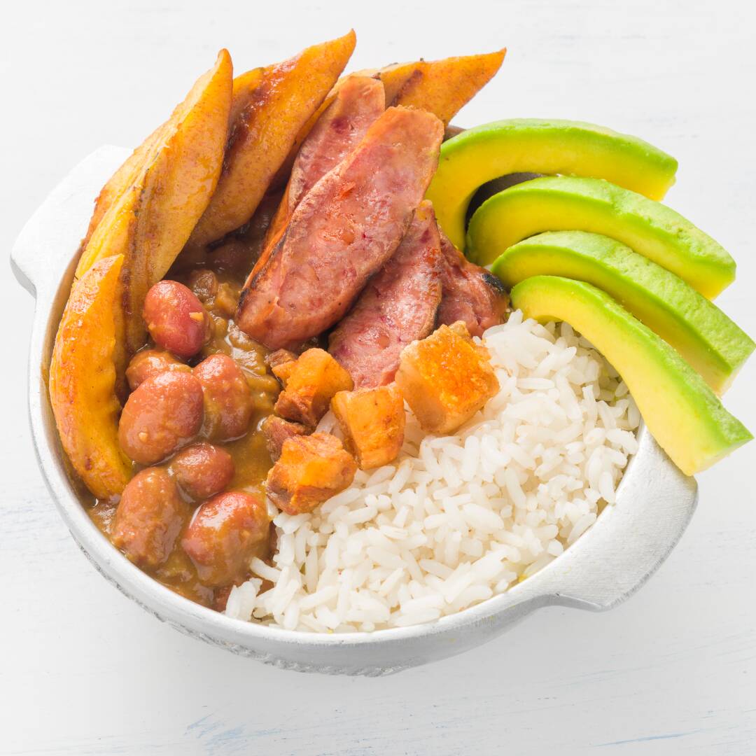 Con todo el sazón paisa; generosa bandeja de frijoles o lentejas, acompañada de carne molida, chorizo o morcilla, chicharrón, plátano maduro, arroz, aguacate, huevo y arepa.