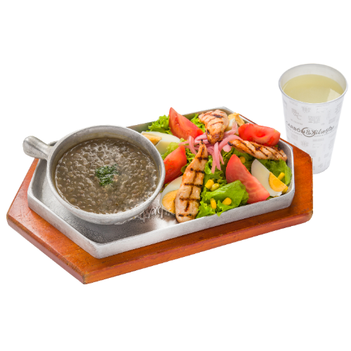 Sopita a elección acompañada de ensalada con lomitos de pollo, huevo, lechuga, tomate, maíz, cebolla encurtida y bebida.