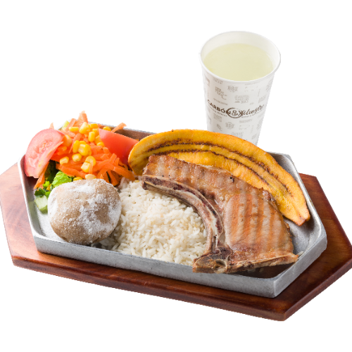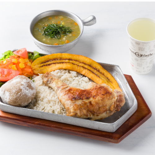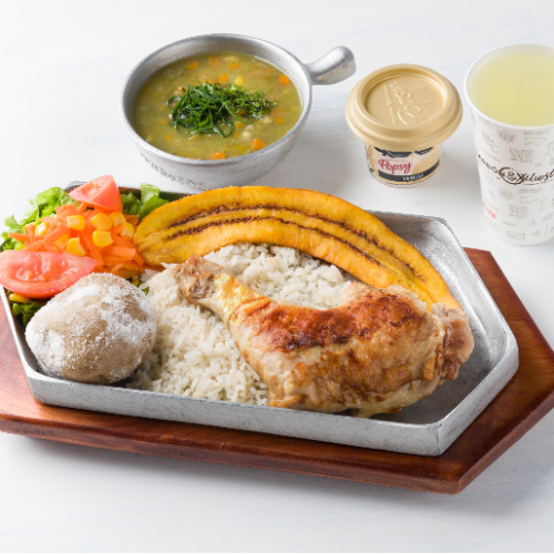 Proteína a elección, acompañada de arroz, plátano maduro, papa salada, ensalada, bebida de 12oz, elige entre: sopita o helado popsy.