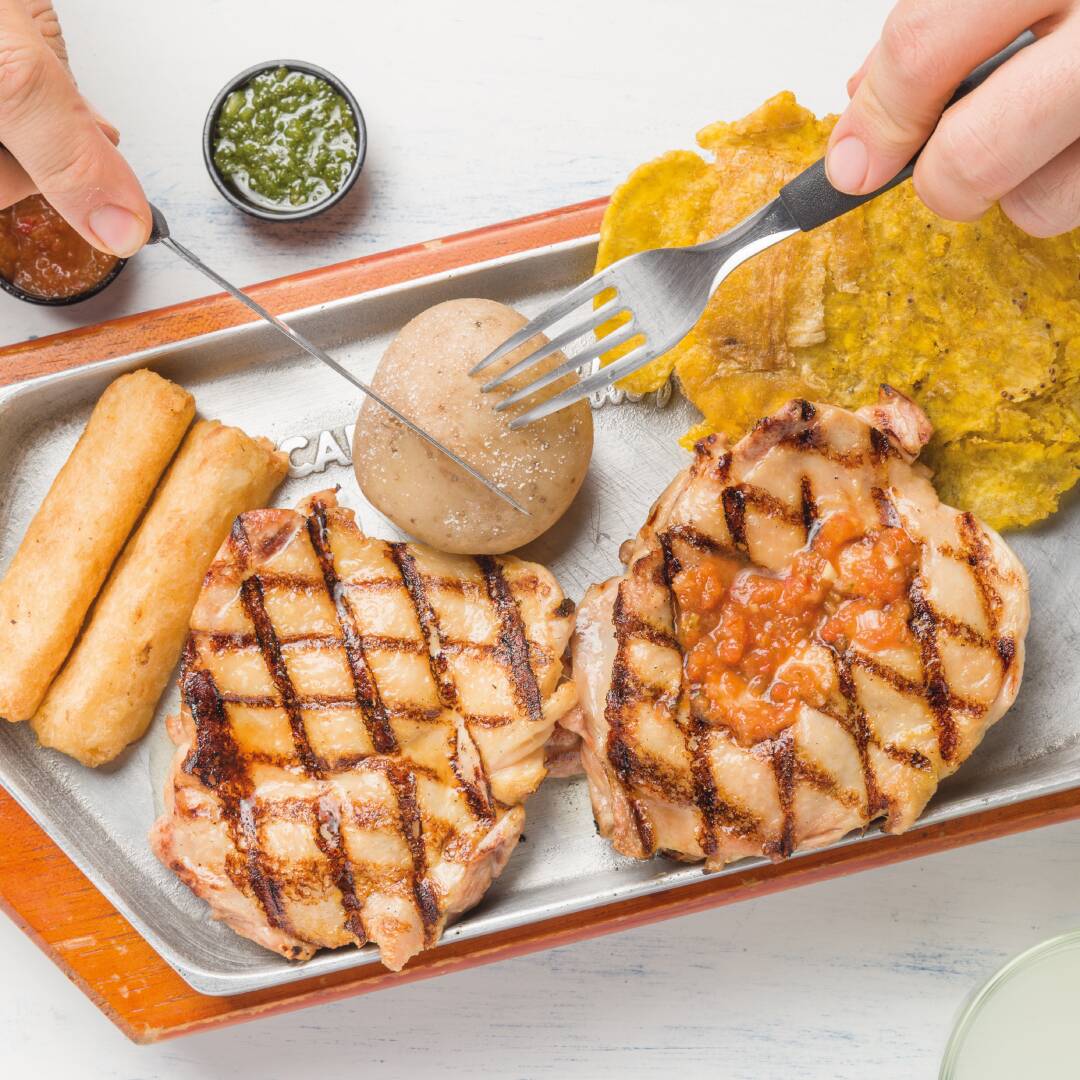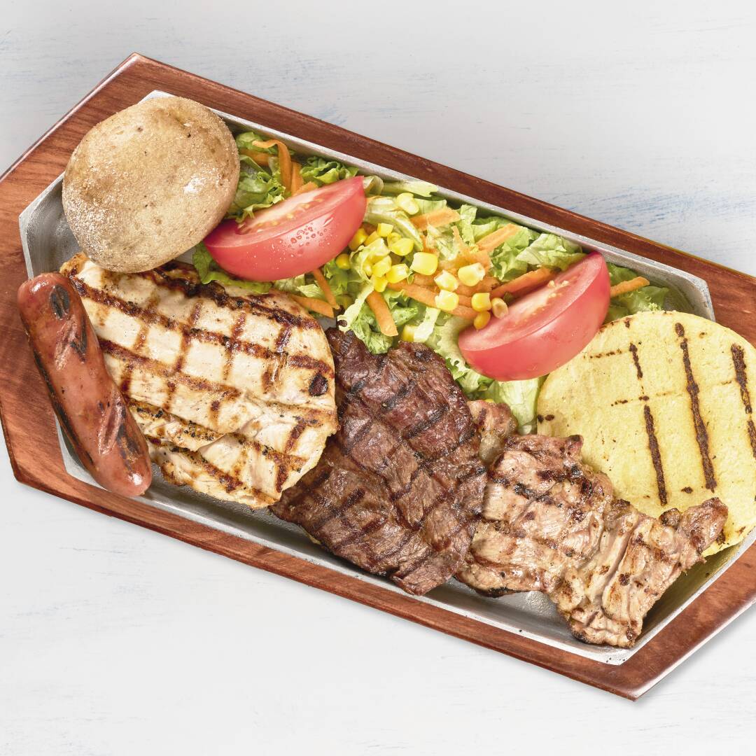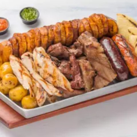 Auténtica picada colombiana con costilla de cerdo, chorizo, lomo fino de res, lomitos de pollo, arepa, papa criolla y plátano maduro.
