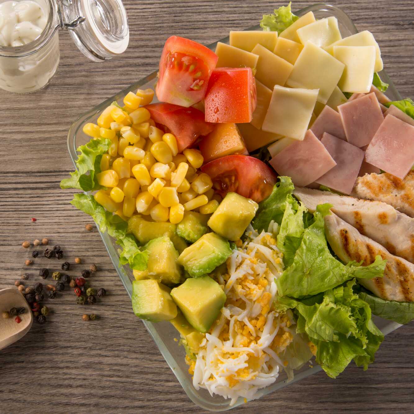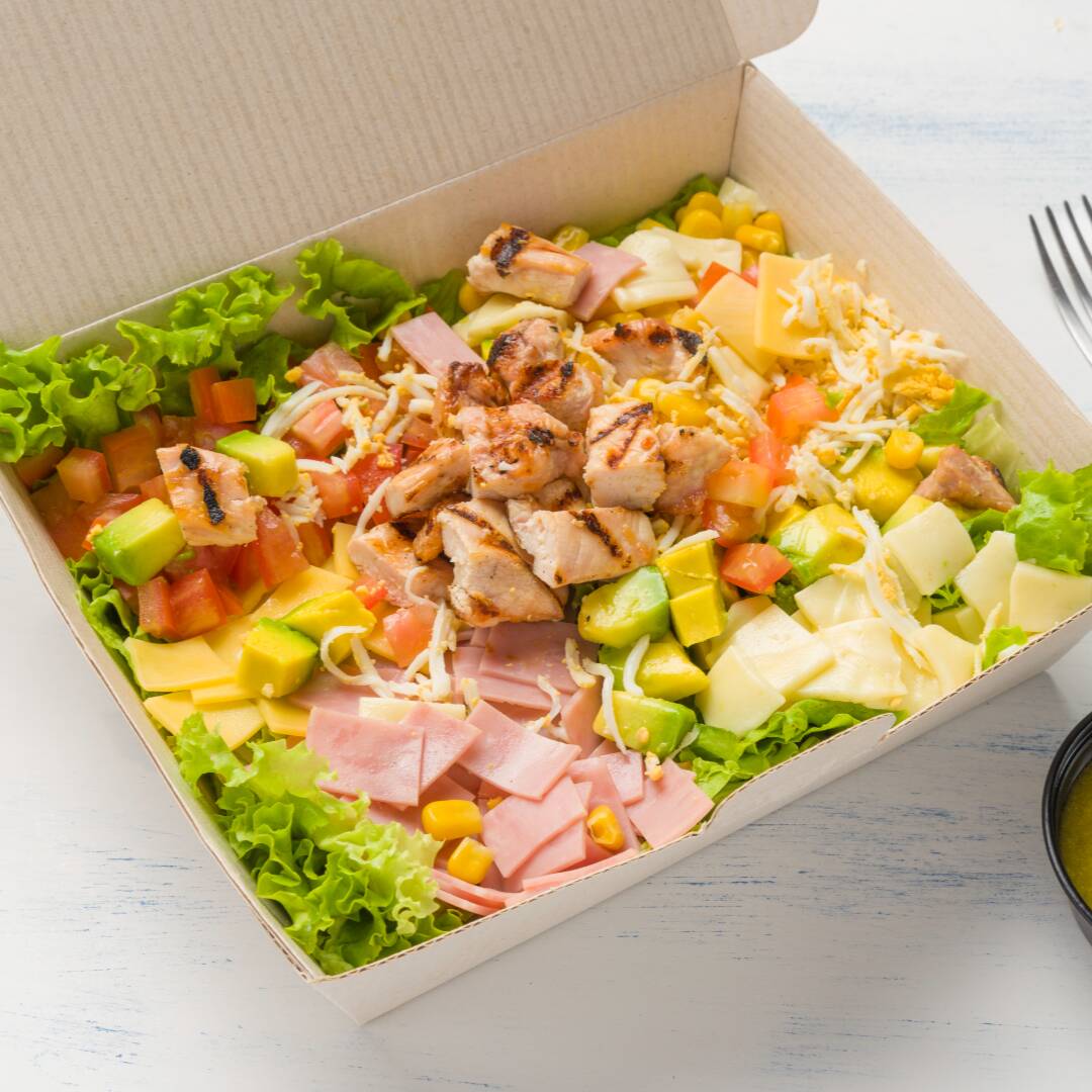 Saludable ensalada con lomitos de pollo, jamón, lechuga verde crespa, queso mozzarella y holandés, tomate, huevo, maíz tierno y aguacate.