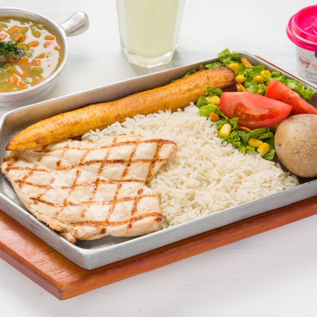 Media porción de carne de res de pollo o de cerdo, acompañado de arroz, plátano maduro, papa salada, ensalada de tomate, lechuga, cebolla, bebida, sopa y postre a elección.