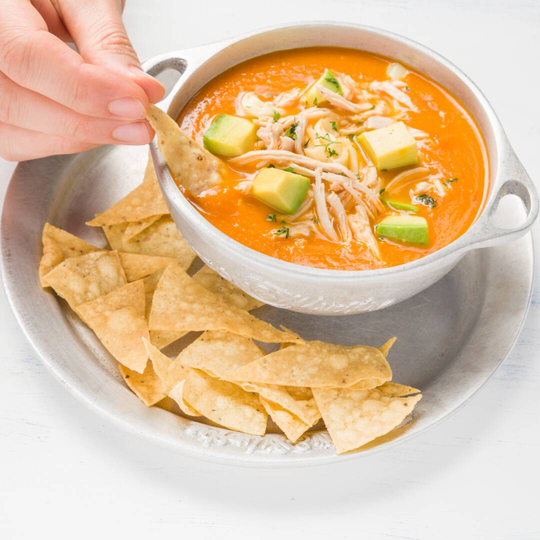 Espectacular sopa a base de tomate y tortillas con pollo desmenuzado, queso mozzarella en julianas, cuadritos de tomate, cilantro con totopos.