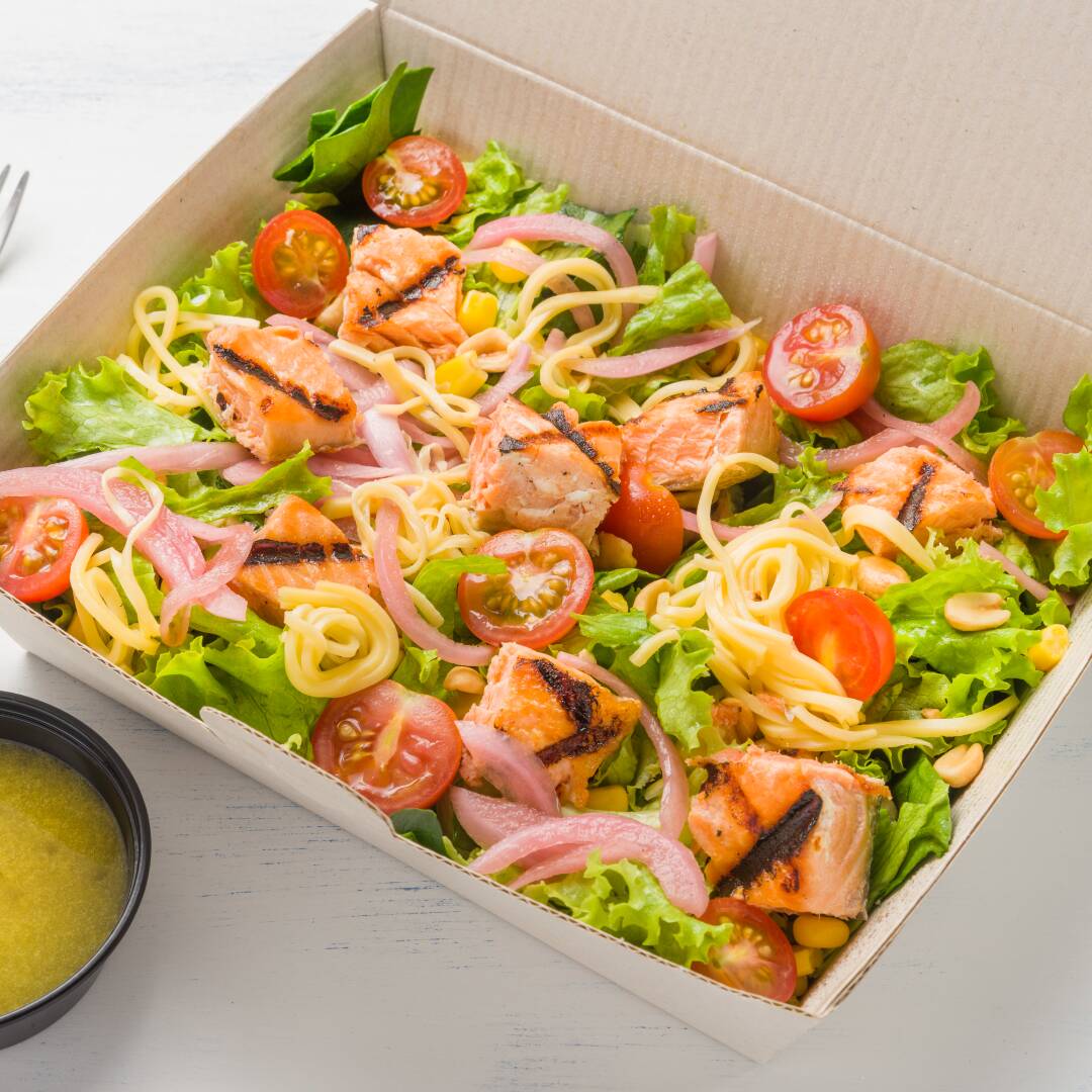 Balanceada ensalada a base de una nutritiva selección de lechuga verde crespa y romana mezcladas con tomate cherry, salmón fresco, maíz tierno, cebollita encurtida, queso holandés con maní crocante, aderezada con salsa ponzu más salsa soya con limón y ajonjolí.