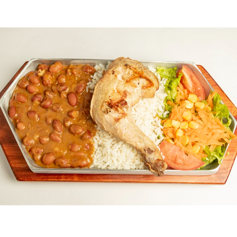 Media porción de pollo o de cerdo, acompañado de arroz, plátano maduro, papa salada, ensalada de tomate, lechuga, cebolla, bebida y postre a elección.