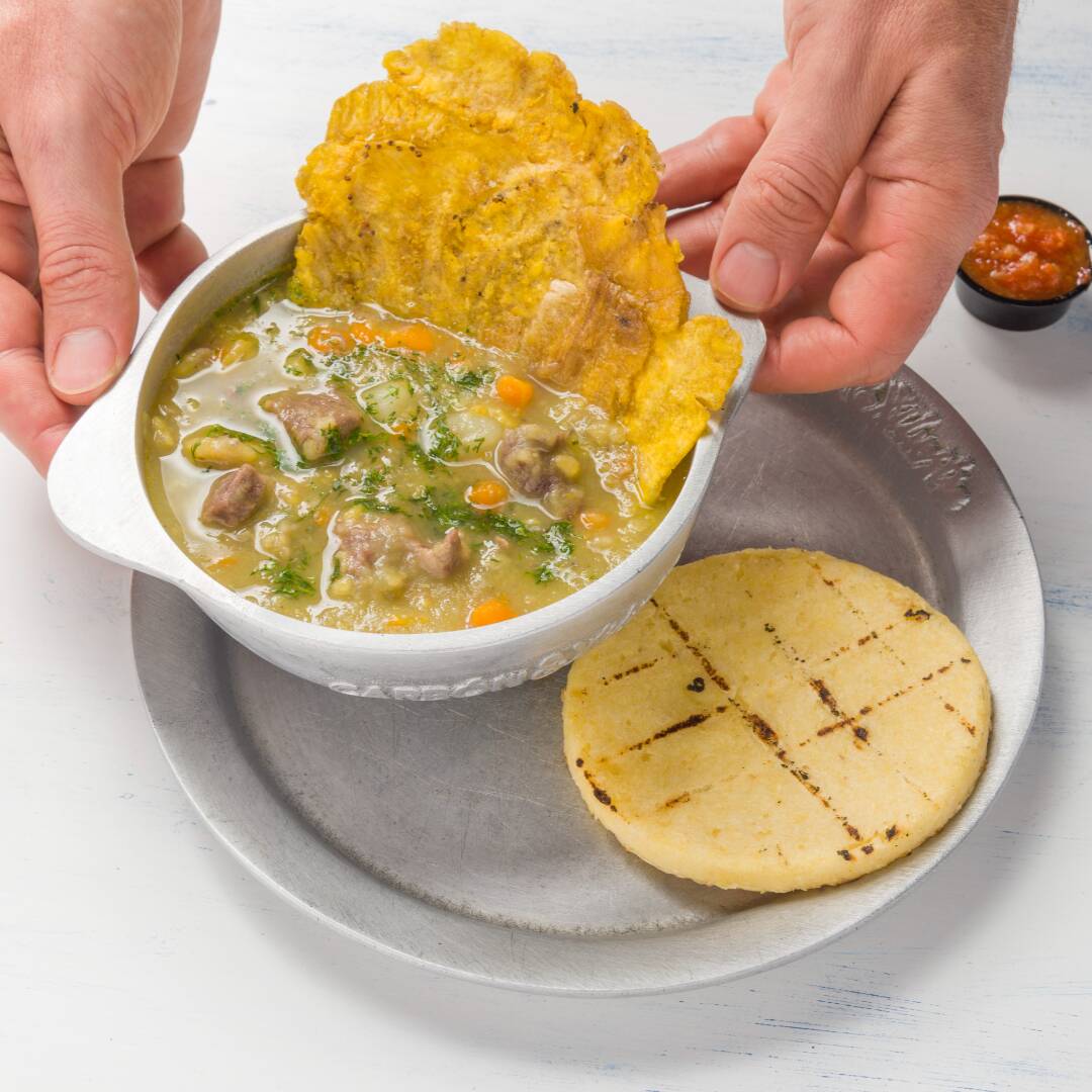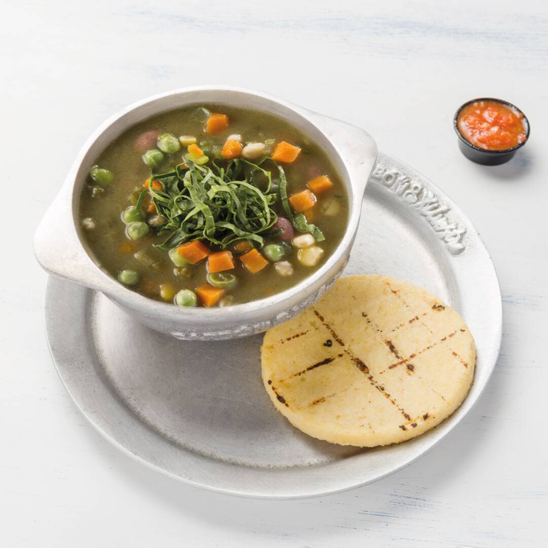 El tradicional sabor bogotano, acompañado de pollo desmenuzado, arroz, aguacate, mazorca, crema de leche y alcaparras.