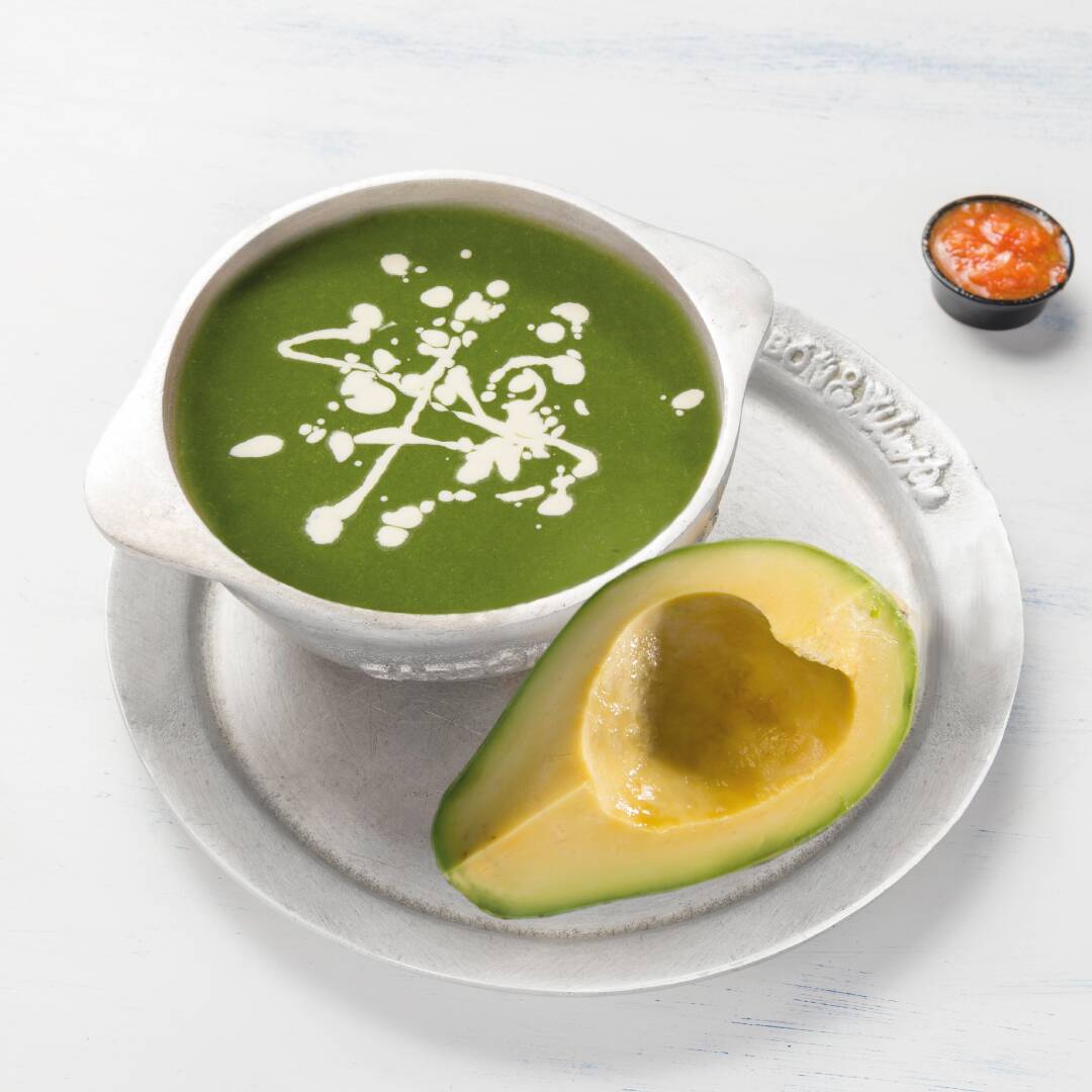 Sensacional sopa de espinacas frescas, acompañada de aguacate y crema de leche.