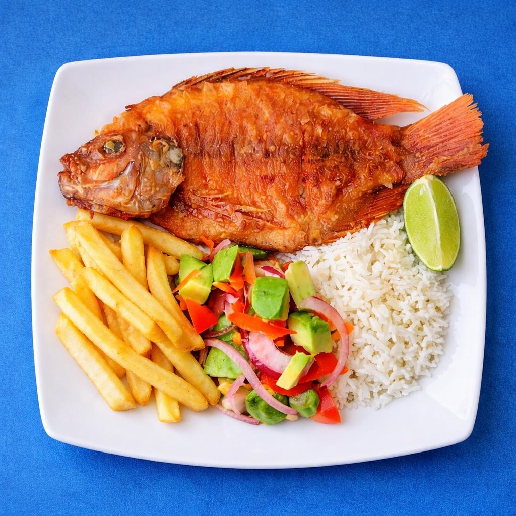 1 MOJARRA DE 200GR APROX FRITA+ 3 ACOMPAÑANTES(ARROZ, YUCA O PAPA, ENSALADA)+ BEBIDA DEL DIA