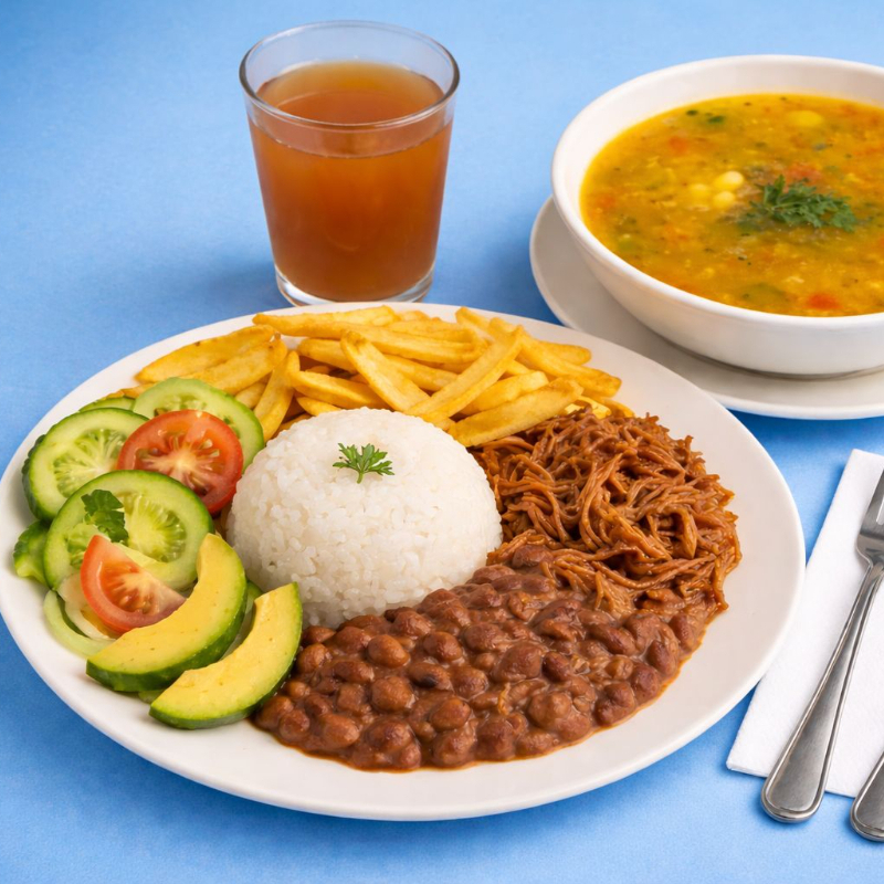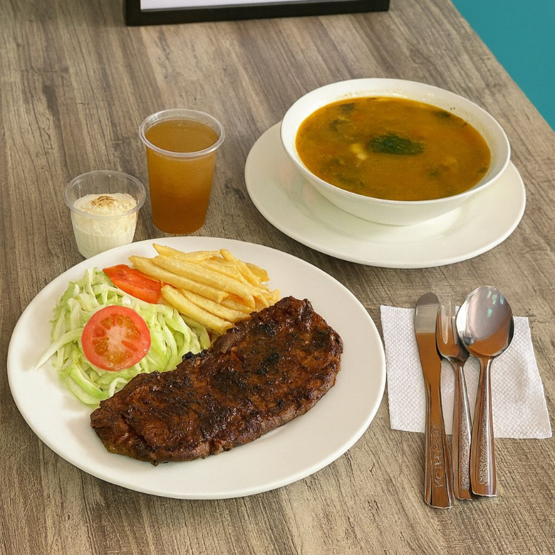 Incluye arroz, porción de carne asada, ensalada fresca de la casa, acompañamiento, bebida de la casa y postre de la casa, preparado según la receta del día.