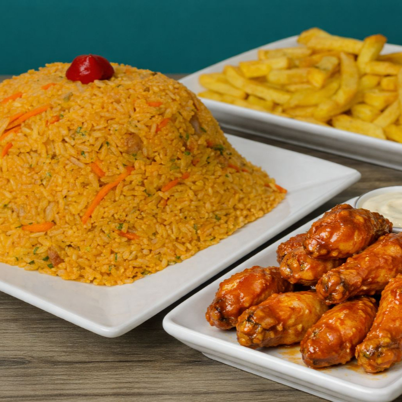 arroz guisado salteado con zanahoria y repollo, mezclado con la proteína del día, acompañamiento, 10 piezas de alitas bbq (porciones pensadas en personas que comen normal, si desea mas cantidad te recomendamos agrandar el combo o añadir claros de sopa)