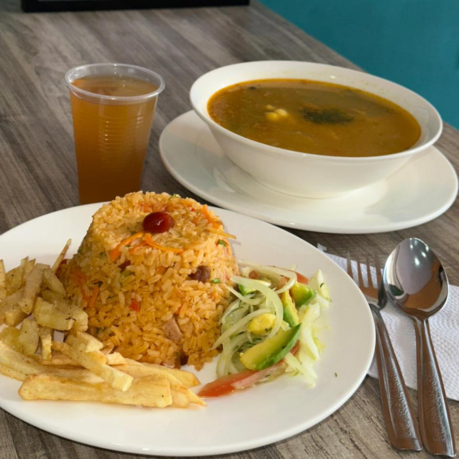 Arroz guisado salteado con zanahoria y repollo, mezclado con la proteína del día, acompañamiento del dia (40/50 gramos), claro de sopa del día o huevo (si no hay claro de sopa)y bebida del día. PORCIONES NORMALES SI USTED COME MUCHO RECOMENDAMOS AGRANDAR