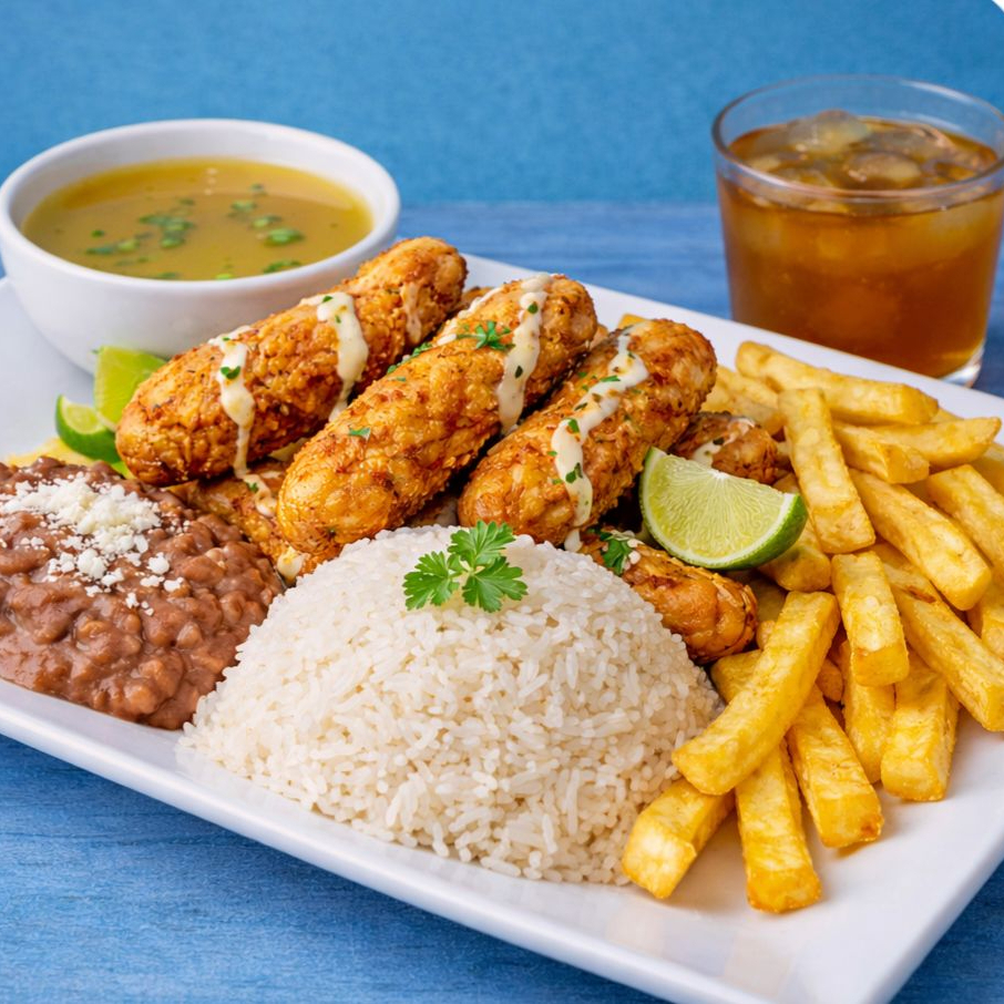 Arroz blanco acompañado de tenders de pollo, ensalada de la casa, acompañante disponible y principio del día o huevo (si no hay disponibilidad), claro de sopa del día o huevo (si no hay disponibilidad) y bebida del día.