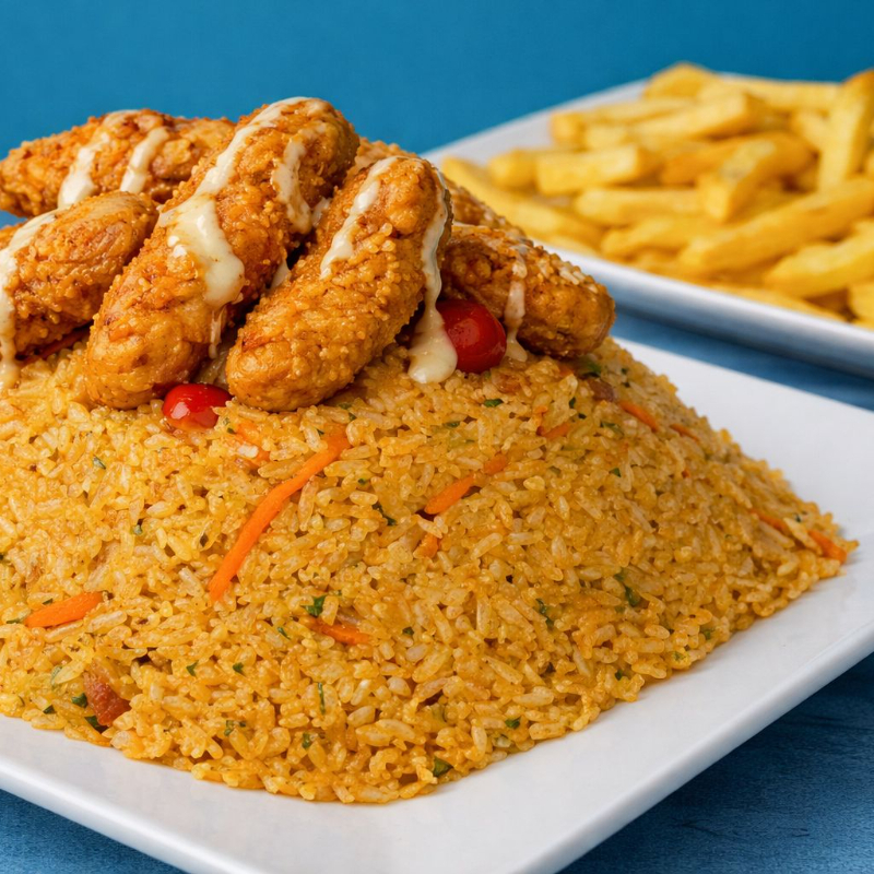 Arroz desvare, tenders de pollo, acompañante disponible, claro de sopa del día más bebida del día, arroz desvare: arroz salteado con vegetales frescos de la casa, acompañado de proteína del día y un toque casero que lo hace práctico, abundante y perfecto para salir del apuro sin perder sabor. (CLARO DE SOPA REMPLAZADO X HUEVO EN CASO DE PRESENTARSE AGOTADO)