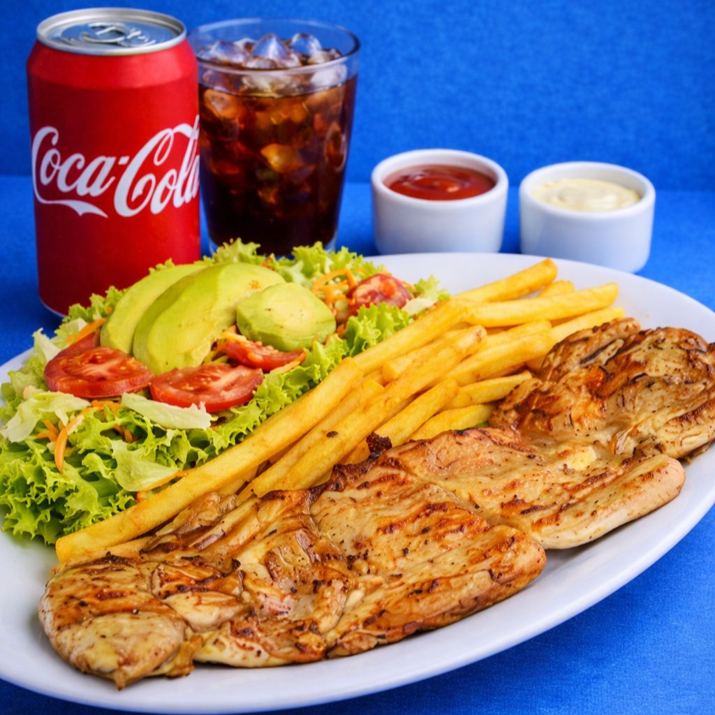 INCLUYE: PECHUGA ASADA 150 GRAMOS + ACOMPAÑANTE + BEBIDA DEL DIA + ENSALADA + 2 SALSAS ALEATORIAS
