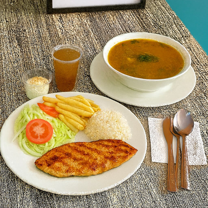 110 GRAMOS DE PECHUGA ASADA, ARROZ BLANCO, ENSALADA, ACOMPAÑANTE DISPONIBLE, BEBIDA DEL DIA, CLARO DE SOPA