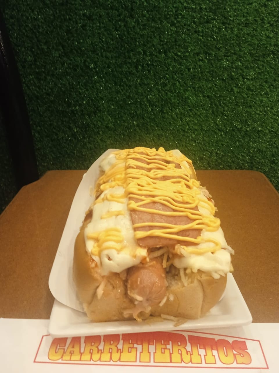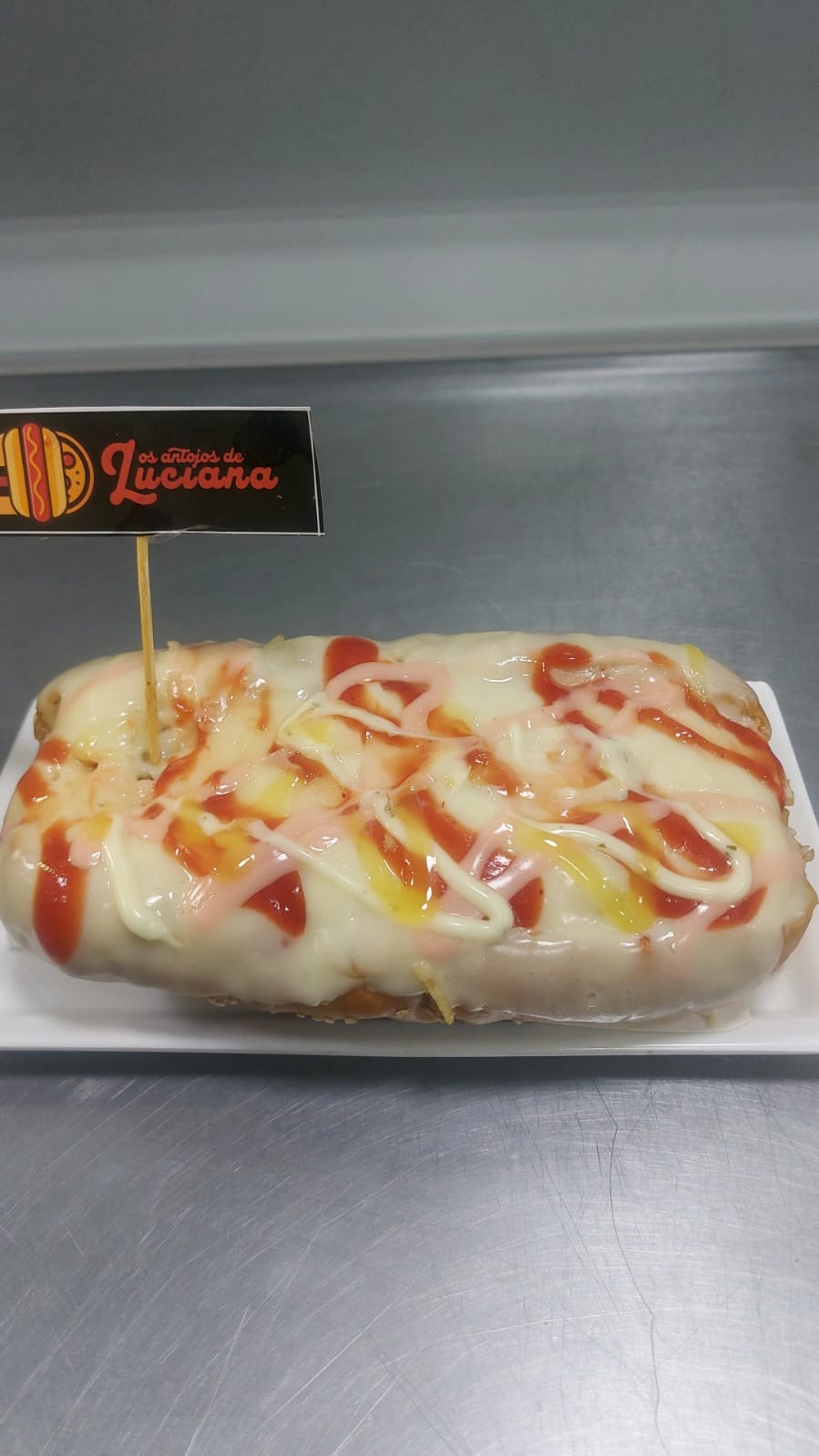 Perro desmechado, pan fresco, salchicha americana, queso, carne y pollo desmechado, maíz, papa cabello de ángel, cebolla y salsas de la casa.