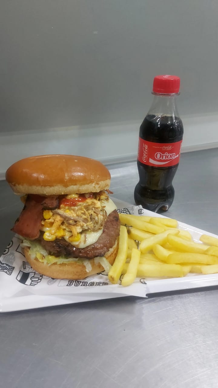 Desmechada burguer 160 g, pan fresco, carne artesanal 160 g, queso, pollo y carne desmechada, maíz, lechuga, cebolla, tomate, papa cabello de ángel y salsas de la casa más papas más gaseosa 250 ml elige tu favorita Pepsi, Manzana, Colombiana.