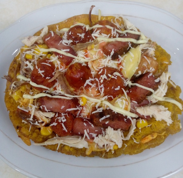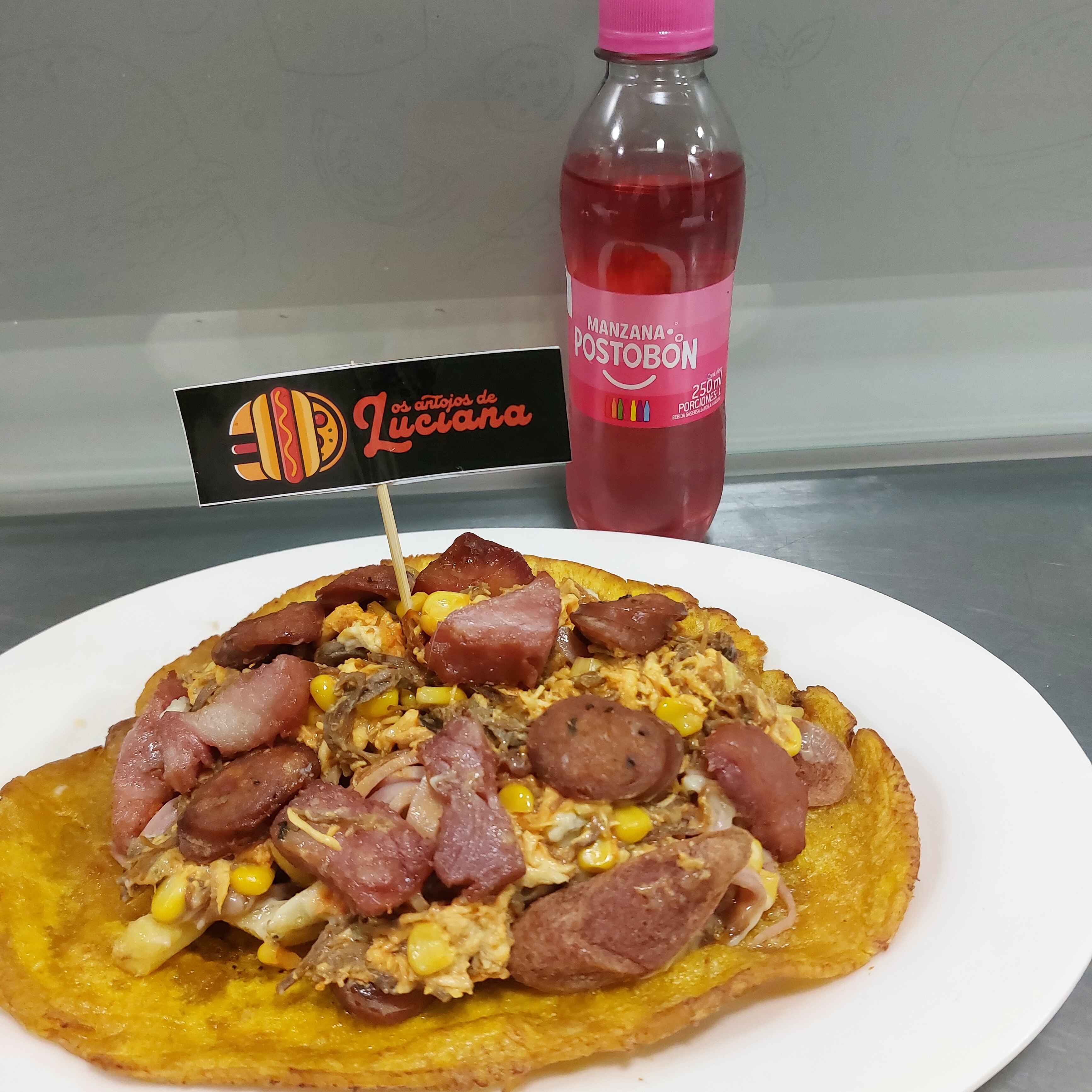 Patacón ranchero, pollo y carne desmechada, maíz, chorizo, salchicha, costillita, papas cabello de ángel, queso y salsas de la casa.