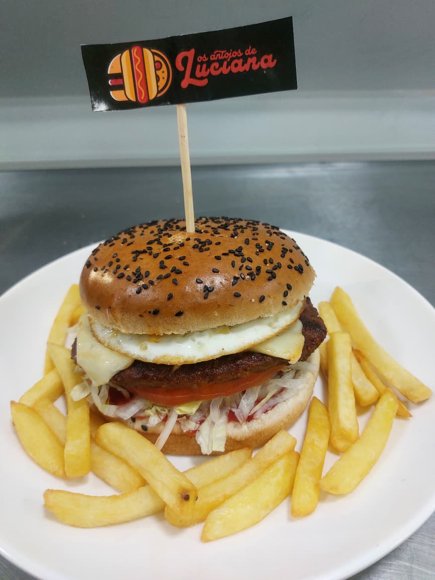 Platacón burguer 160 g, plátano pintón, carne artesanal 160 g, queso, tocineta, lechuga, cebolla, tomate, papa cabello de ángel y salsas de la casa.