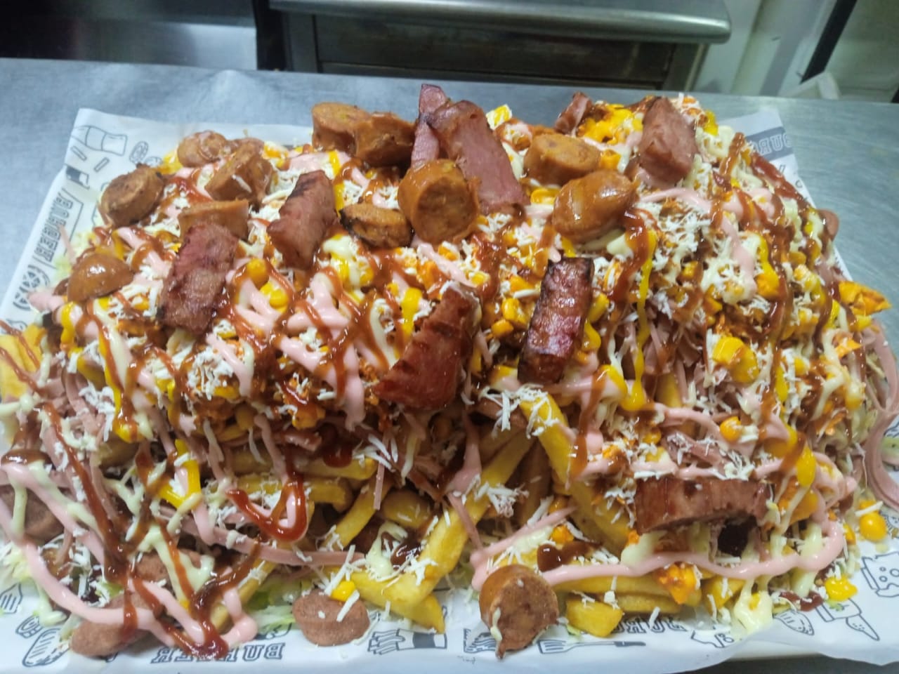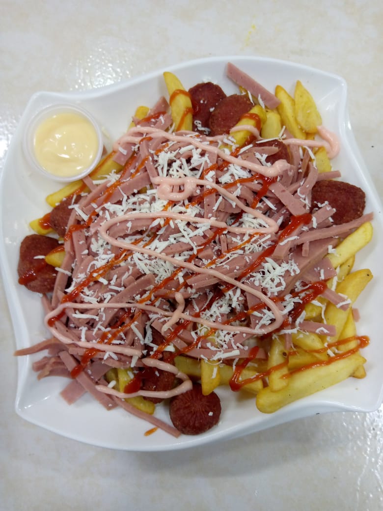 Salchipapa mega, salchicha, papa, jamón, queso, pollo y carne desmechada, maíz, costillitas, chorizo, tocineta, papas cabello de ángel y salsas de la casa.