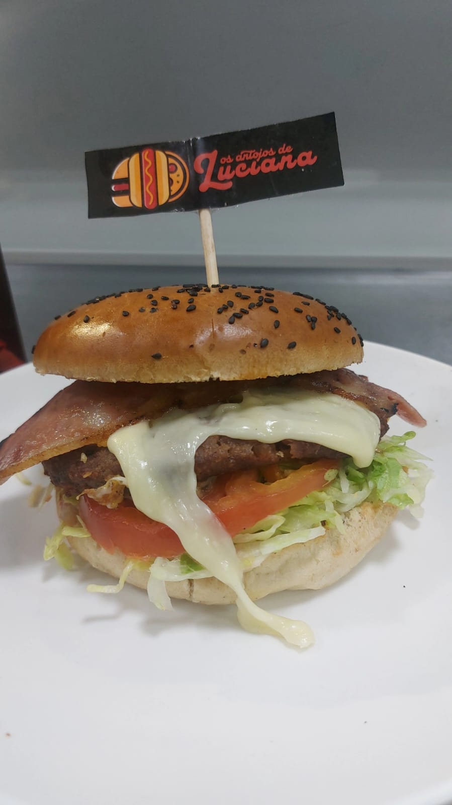 Ranchera con tocineta de 125 g, pan fresco, carne artesanal, queso, lechuga, cebolla, tomate, tocineta, papa cabello de ángel y salsas de la casa.