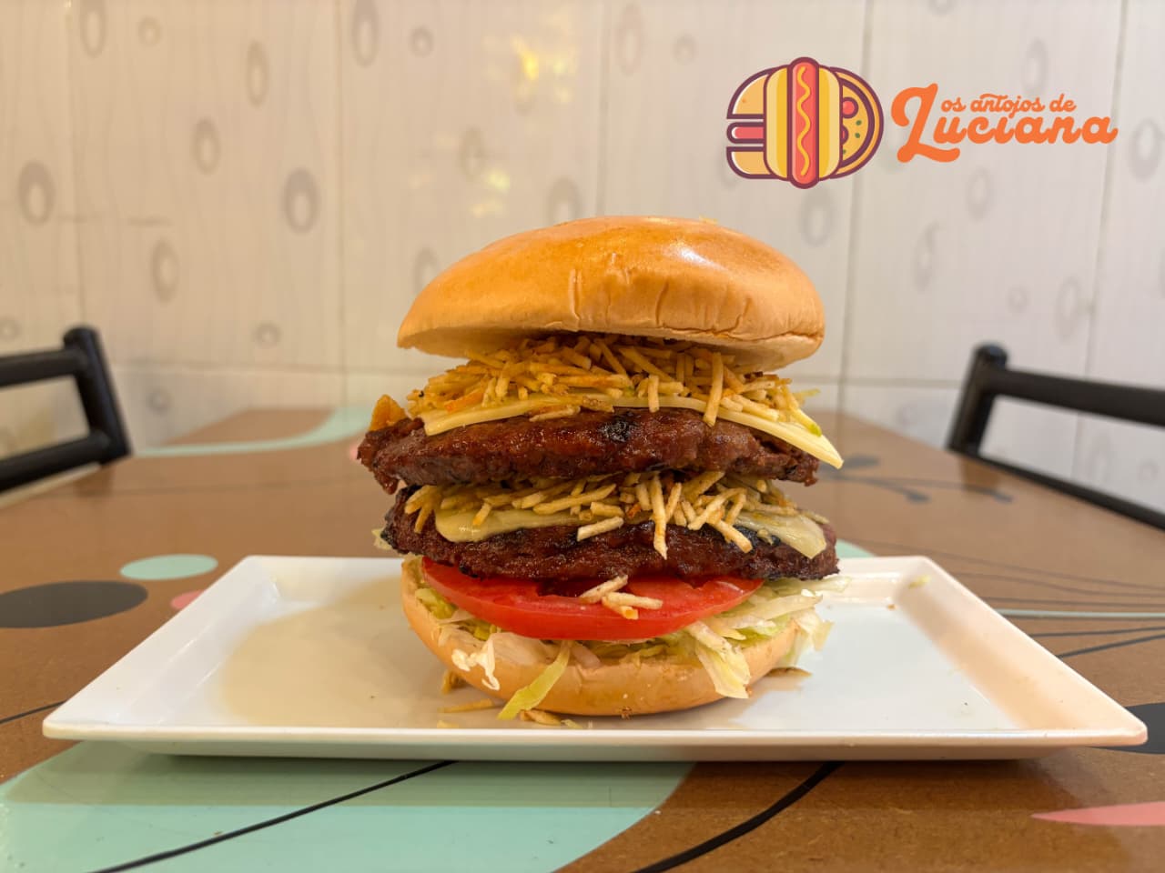 Maxi burguer 160 g, pan fresco, carne artesanal 160 g, 2 quesos, chorizo ranchero, arepa paisa, tocineta, lechuga, cebolla, tomate, papa cabello de ángel y salsas de la casa más papas más gaseosa 250 ml elige tu favorita Pepsi, Manzana, Colombiana.