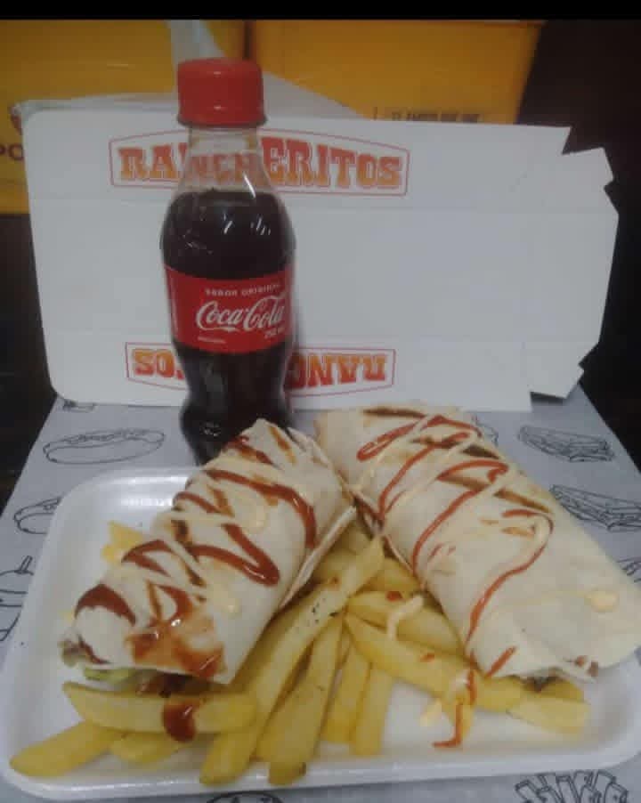 Ranchero de 110 g, pan fresco, salchicha americana, queso, papa cabello de ángel, cebolla, salsas de la casa más papas más gaseosa 250 ml elige tu favorita Pepsi, Manzana, Colombiana.