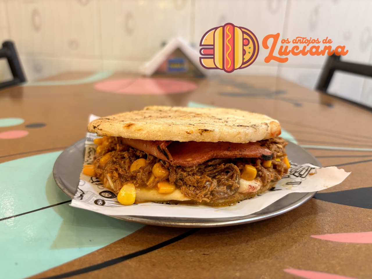 Ranchera, arepa paisa, carne desmechada, pollo desmechado, maíz, tocineta, costillitas, chorizo, doble queso y salsas de la casa.